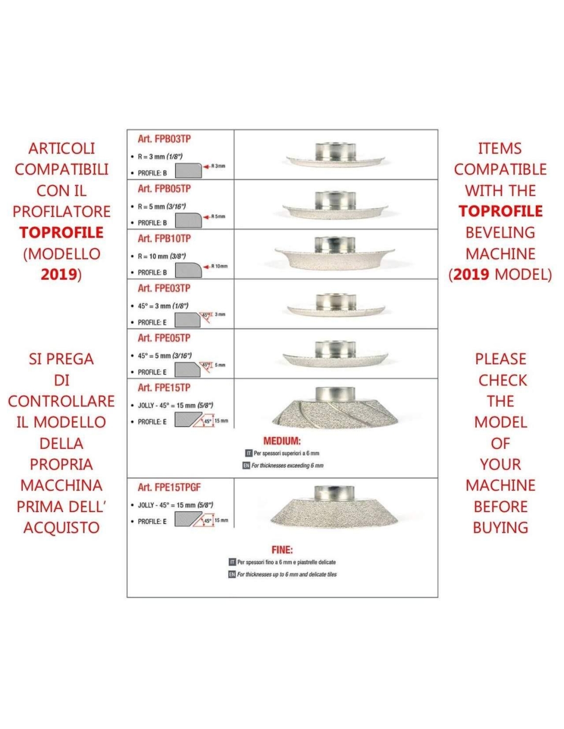 Art. FPE15TPGF: Fresa diamantata grana fine per smussi Jolly a 45° da 15 mm su piastrelle delicate.