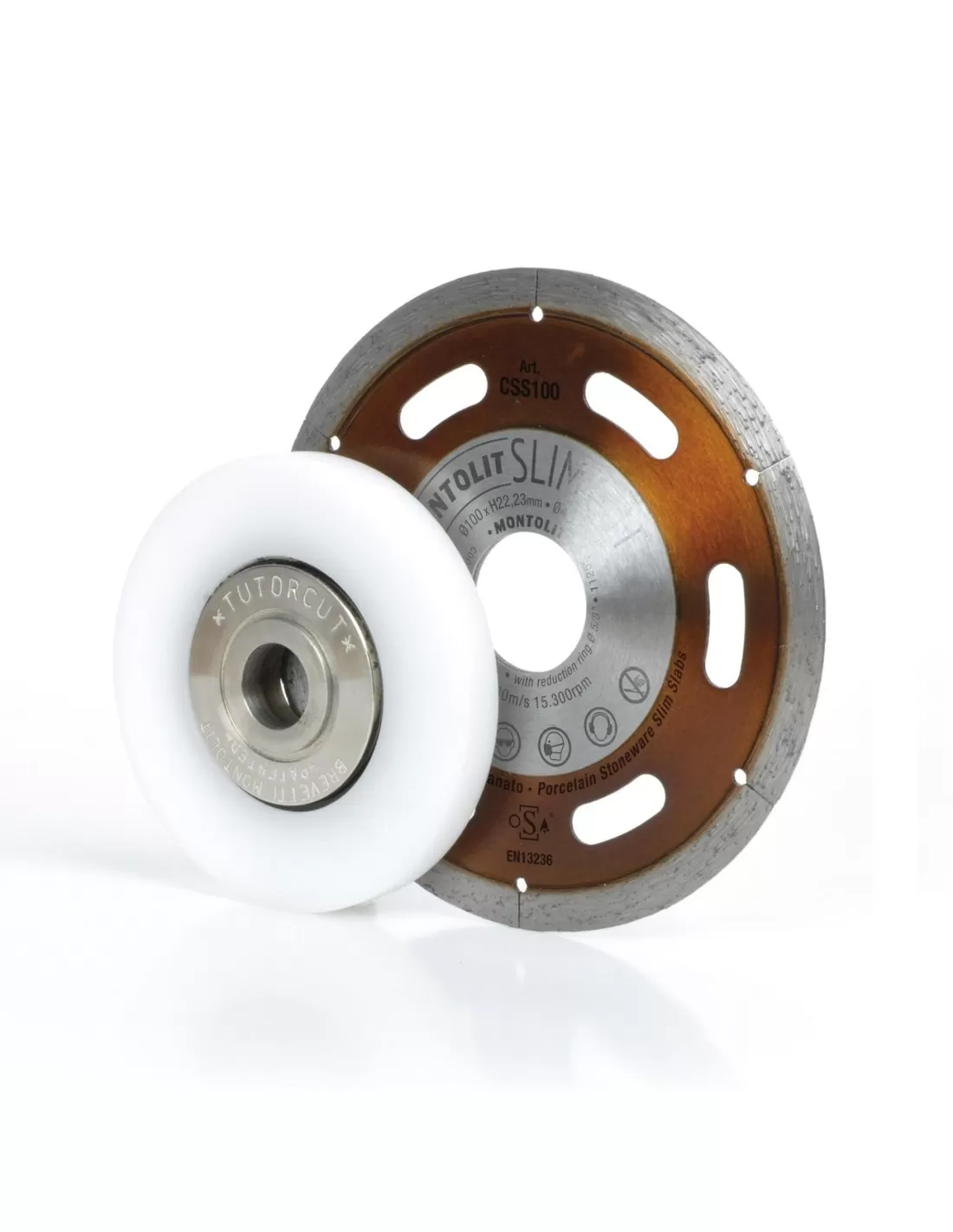 Disco diamantato supersottile CSS100: garantisce tagli a secco superveloci e senza sbavature su lastre Slim e Superslim. L'utensile, con diametro da 100 mm, da smerigliatrice angolare, va utilizzato esclusivamente con TUTORCUT, lo speciale piattello-guida (brevetto Montolit) che garantisce tagli perfettamente lineari ed evita qualsiasi involontaria manovra che possa compromettere l’integrità dell’utensile diamantato.