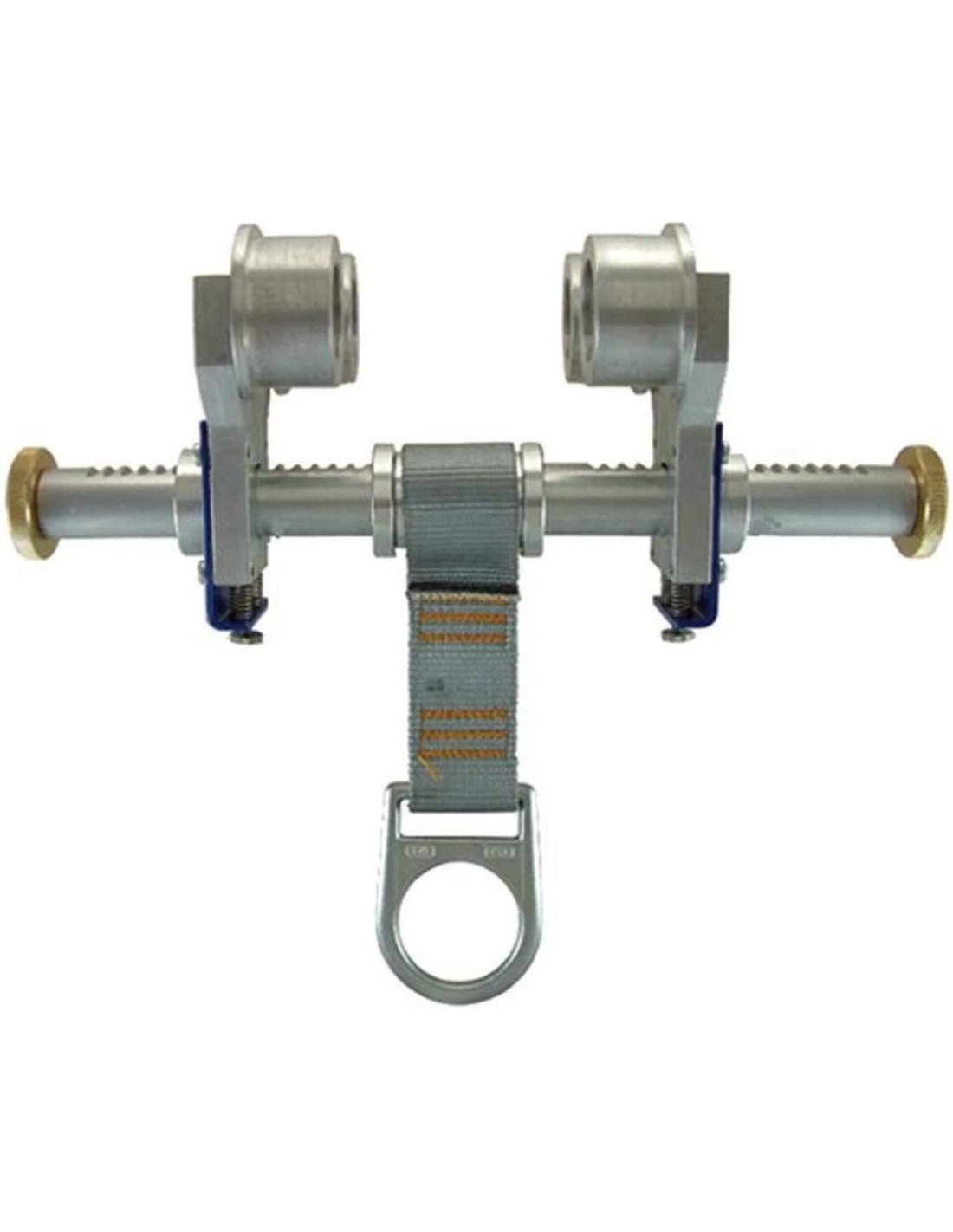 Dispositivo di ancoraggio provvisorio trasportabile con rotelle in lega di alluminio. Può essere fissato tra putrelle di larghezza variabile tra 76 e 255 mm.