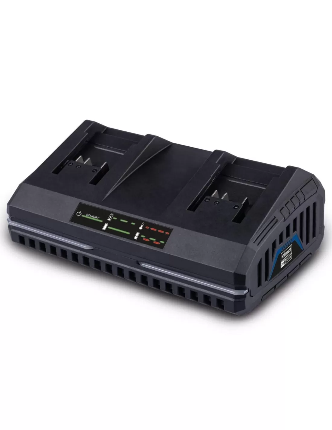 Con il caricabatterie doppio Scheppach SDBC2.4A è possibile ricaricare due batterie contemporaneamente in brevissimo tempo. Il pratico caricabatterie può essere utilizzato per tutte le batterie della serie Scheppach IXES da 20 volt. La batteria e lo stato di carica possono essere letti anche sul chiaro display LED. La gestione intelligente della ricarica garantisce inoltre una maggiore autonomia e una maggiore durata di vita.