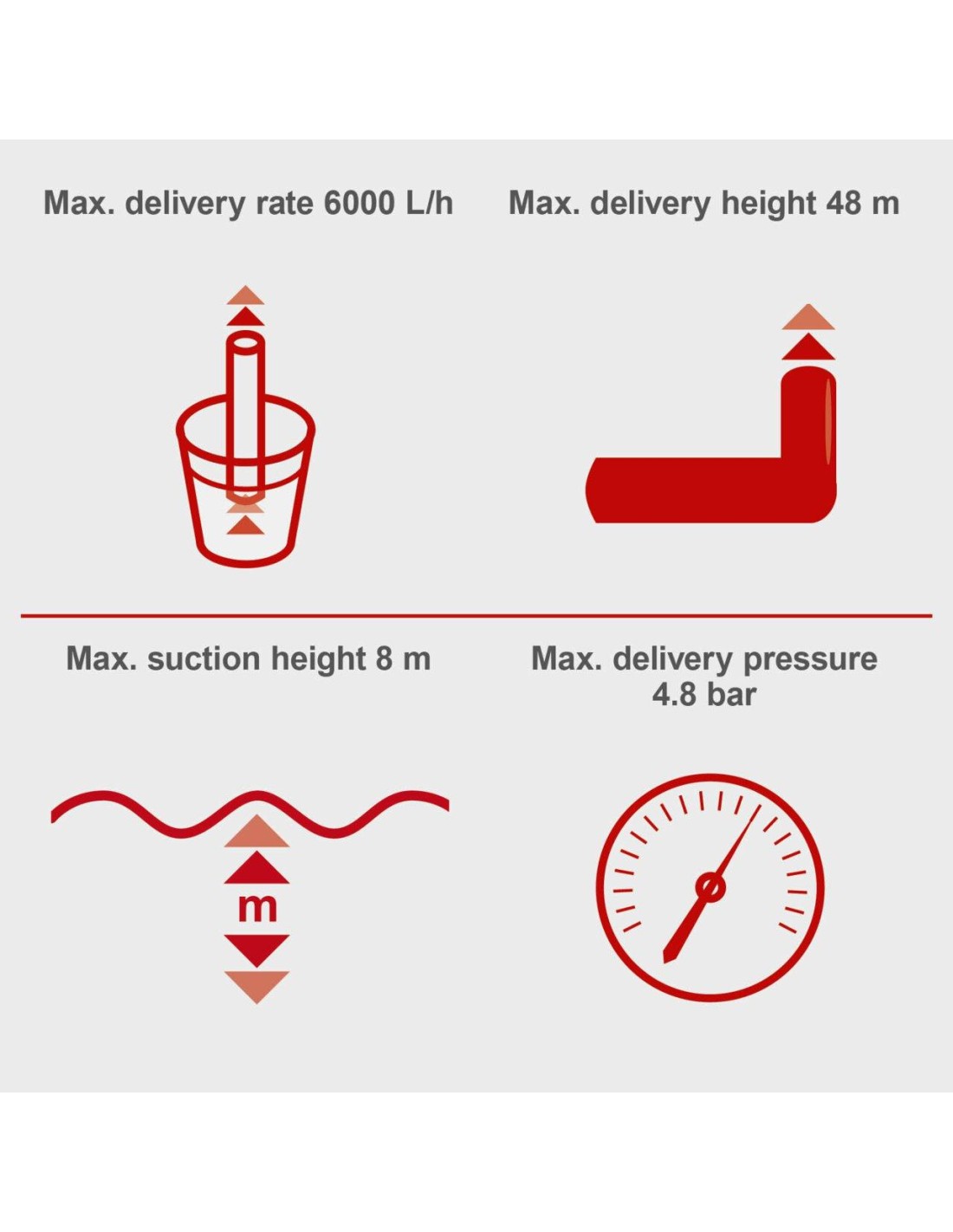 - Altezza massima di mandata 48 m, altezza massima di aspirazione 8 m
