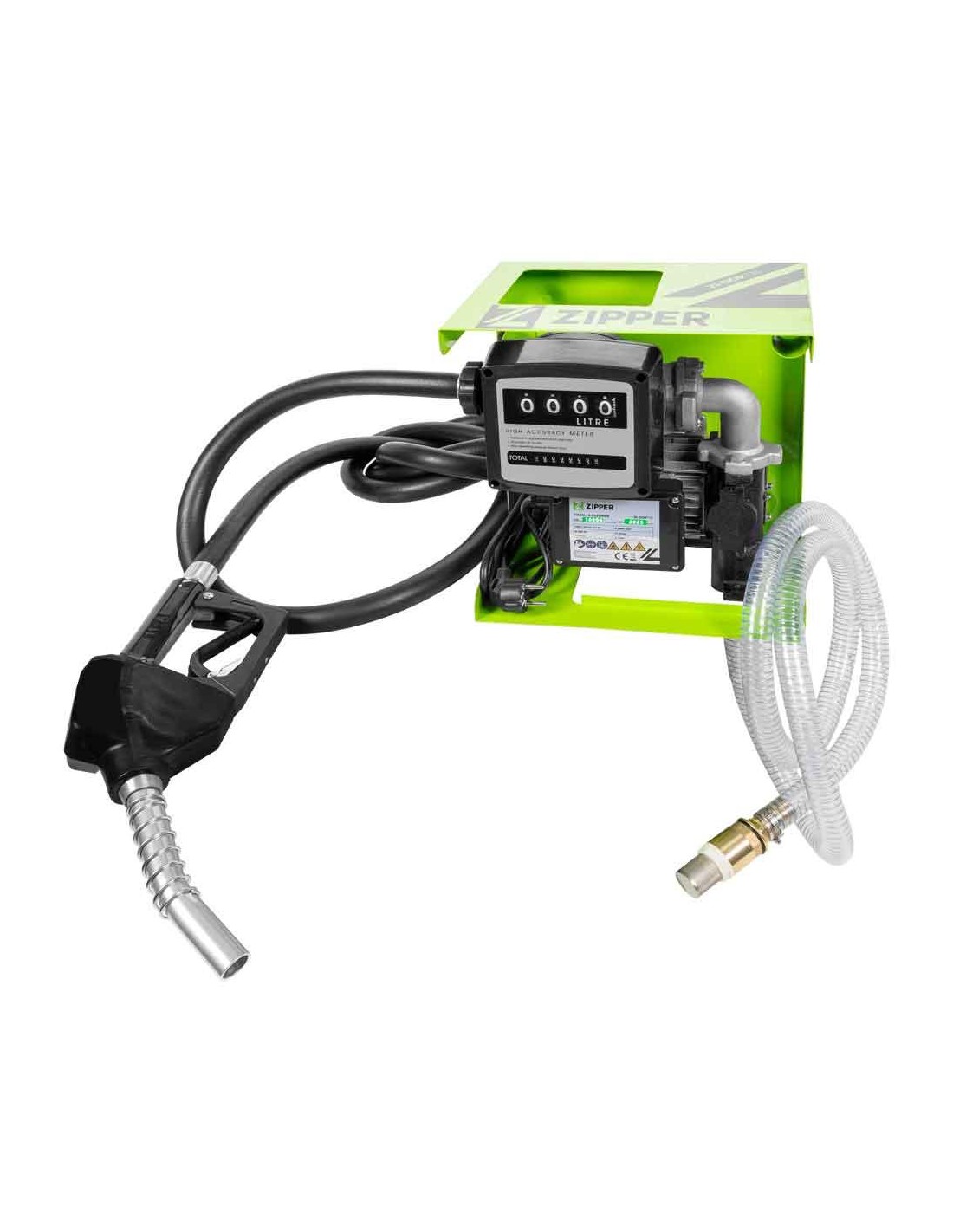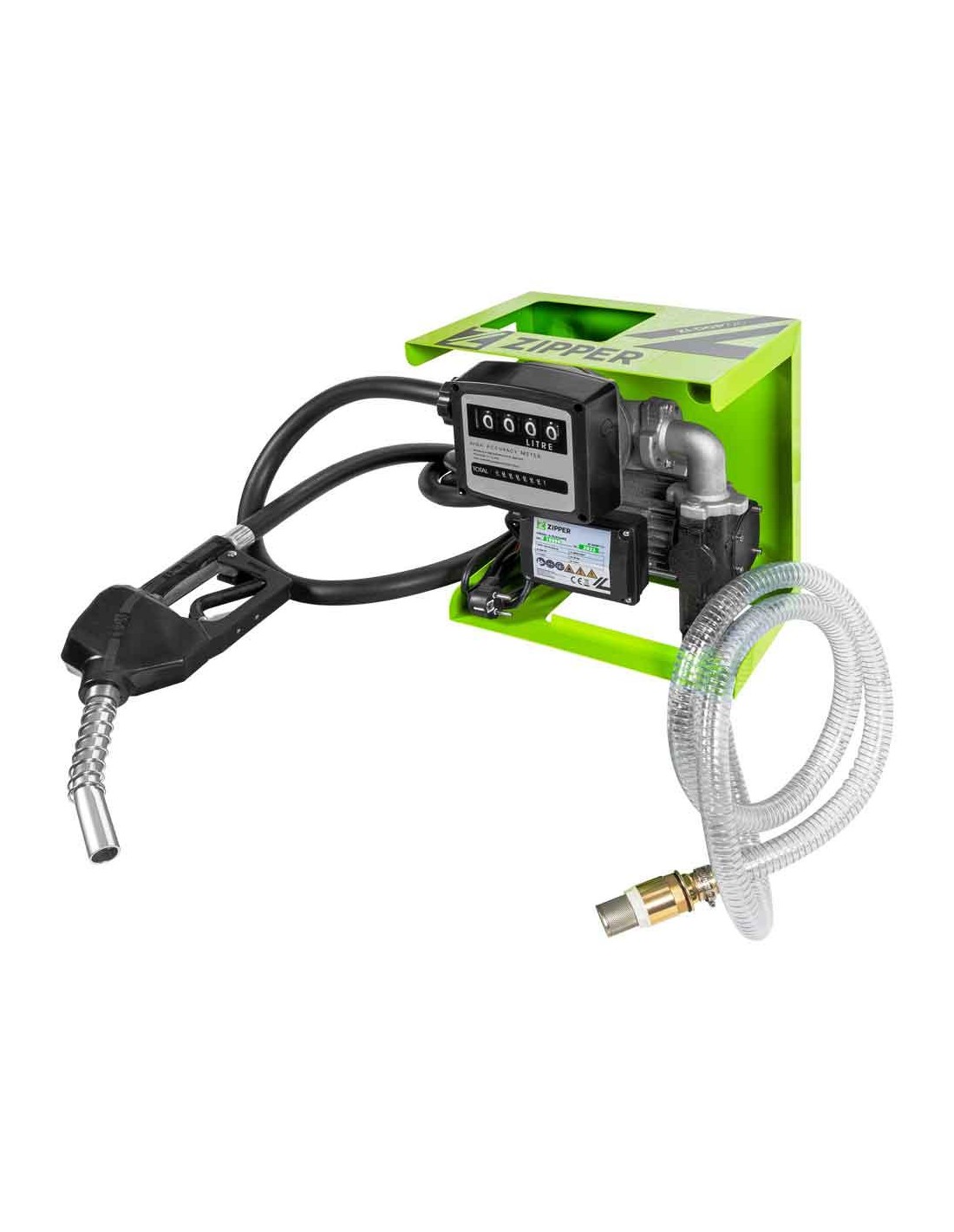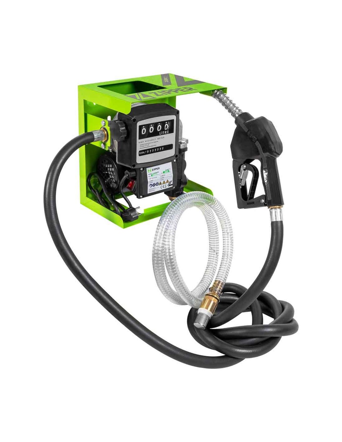 Tubo di aspirazione da 2 m, tubo di erogazione da 4 m, ugello in alluminio, contatore, anelli di tenuta e connettori, alloggiamento