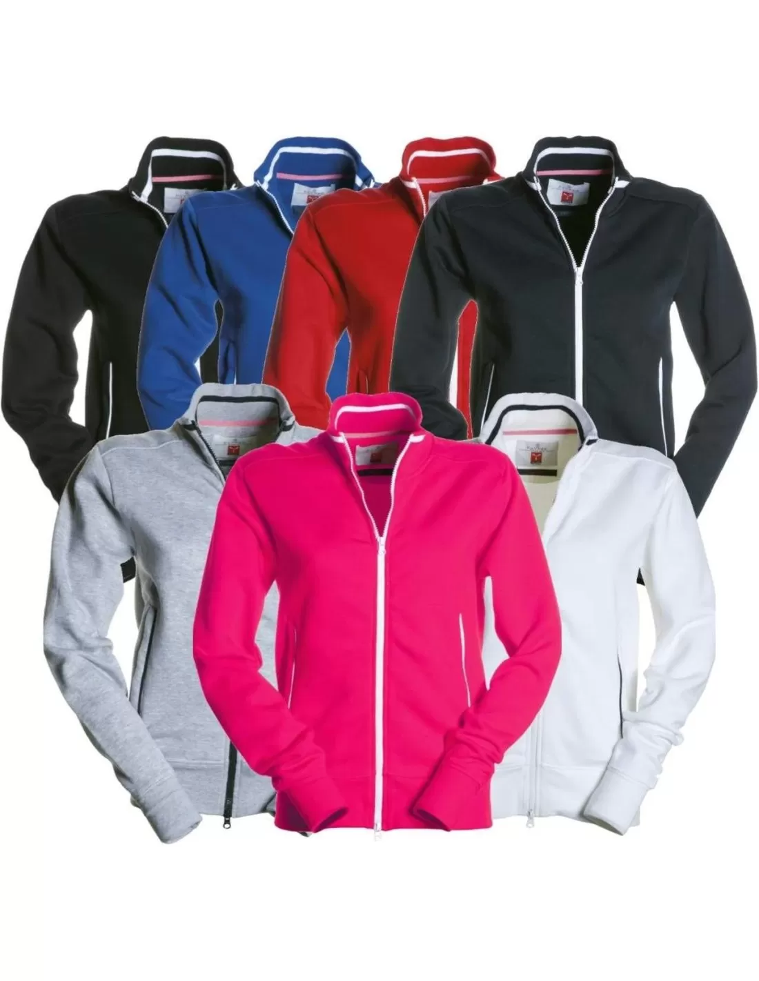 Felpa sfiancata da donna a zip intera a doppio cursore con colletto con riga in contrasto, due tasche esterne, polsini e vita in costina elasticizzata, doppia cucitura