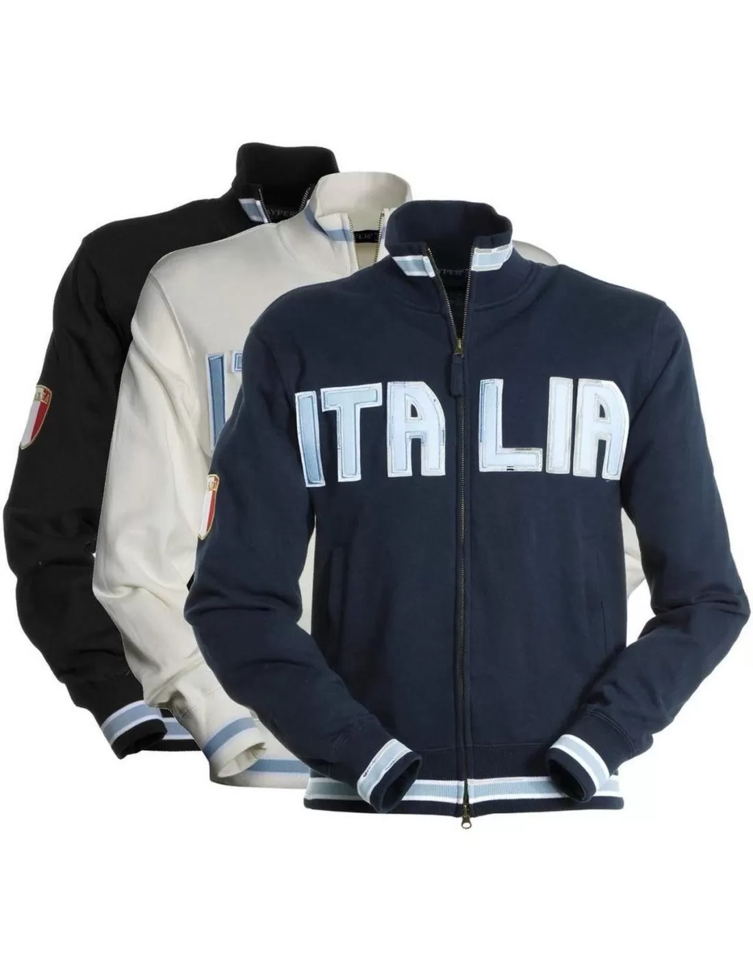 Felpa multistagione a zip intera coperta in metallo con doppio cursore; righe a contrasto nel colletto, nei polsini e in vita, scritta ITALIA al petto e scudetto tricolore/Italia al braccio destro. Due tasche.