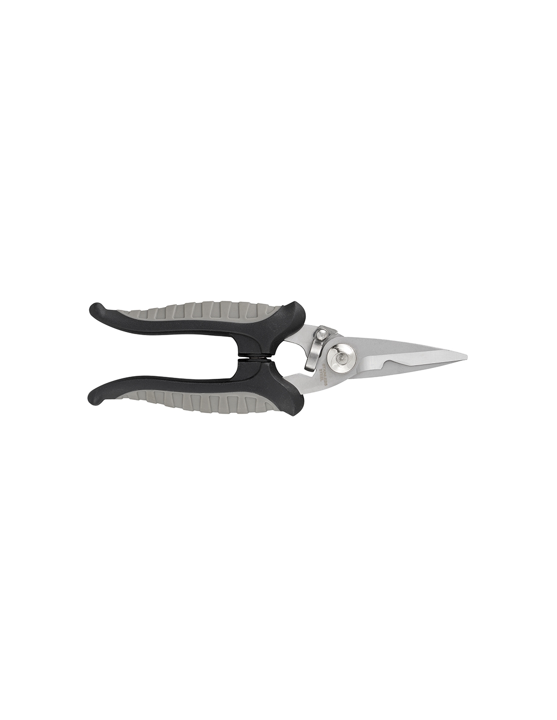 Forbice multiuso con lama a rasoio microdentata in acciaio inox, manico ergonomico antiscivolo bicolore in plastica e gomma.