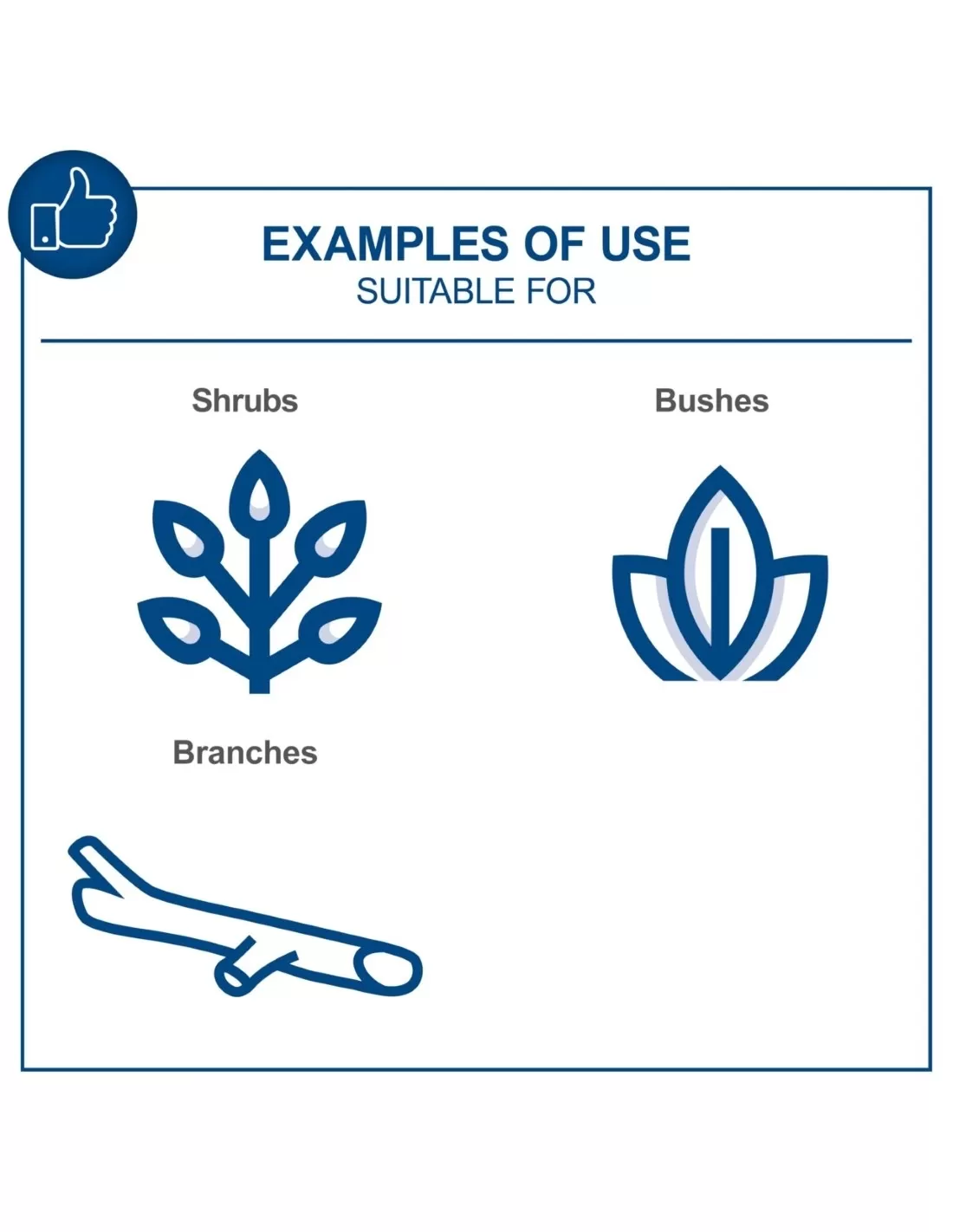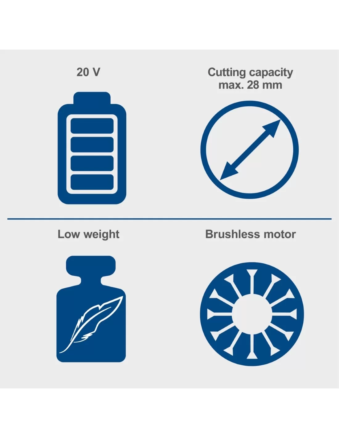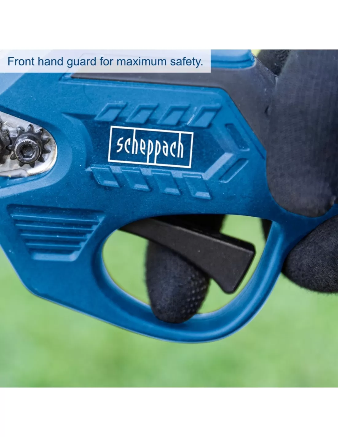 FORBICI DA POTATURA A BATTERIA • Pratiche forbici da potatura a batteria per un taglio affidabile di rami con uno spessore massimo di 28 mm, ad esempio per la potatura di alberi da frutto, la potatura di siepi o altri lavori • Motore brushless esente da manutenzione e particolarmente efficiente, con maggiore autonomia e durata e bassa usura • Lavoro a batteria con la serie Scheppach IXES 20 Volt – tutte le batterie e i caricabatterie di questa serie di sistemi possono essere combinati con le forbici da potatura a batteria • Acciaio a incudine di alta qualità lame per lavori di taglio precisi e delicati per le piante • 2 diametri di taglio regolabili di 15 mm e 28 mm • Il design ergonomico e compatto con impugnatura morbida garantisce un funzionamento confortevole • La protezione frontale per le mani e la disattivazione automatica dopo 3 minuti garantiscono la massima sicurezza durante il lavoro • Alloggiamento in plastica robusto e durevole • Peso ridotto e design compatto • Batteria e caricabatterie disponibili separatamente