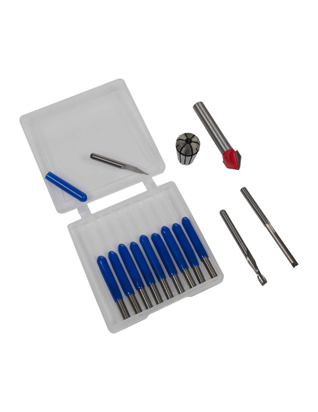 Dotazione: Fresa con punte a V, 2 frese, 10 frese per intaglio, 2 pinze di serraggio (ER11-6 mm, ER11-1/4"), morsetti per pezzi (6 pezzi)