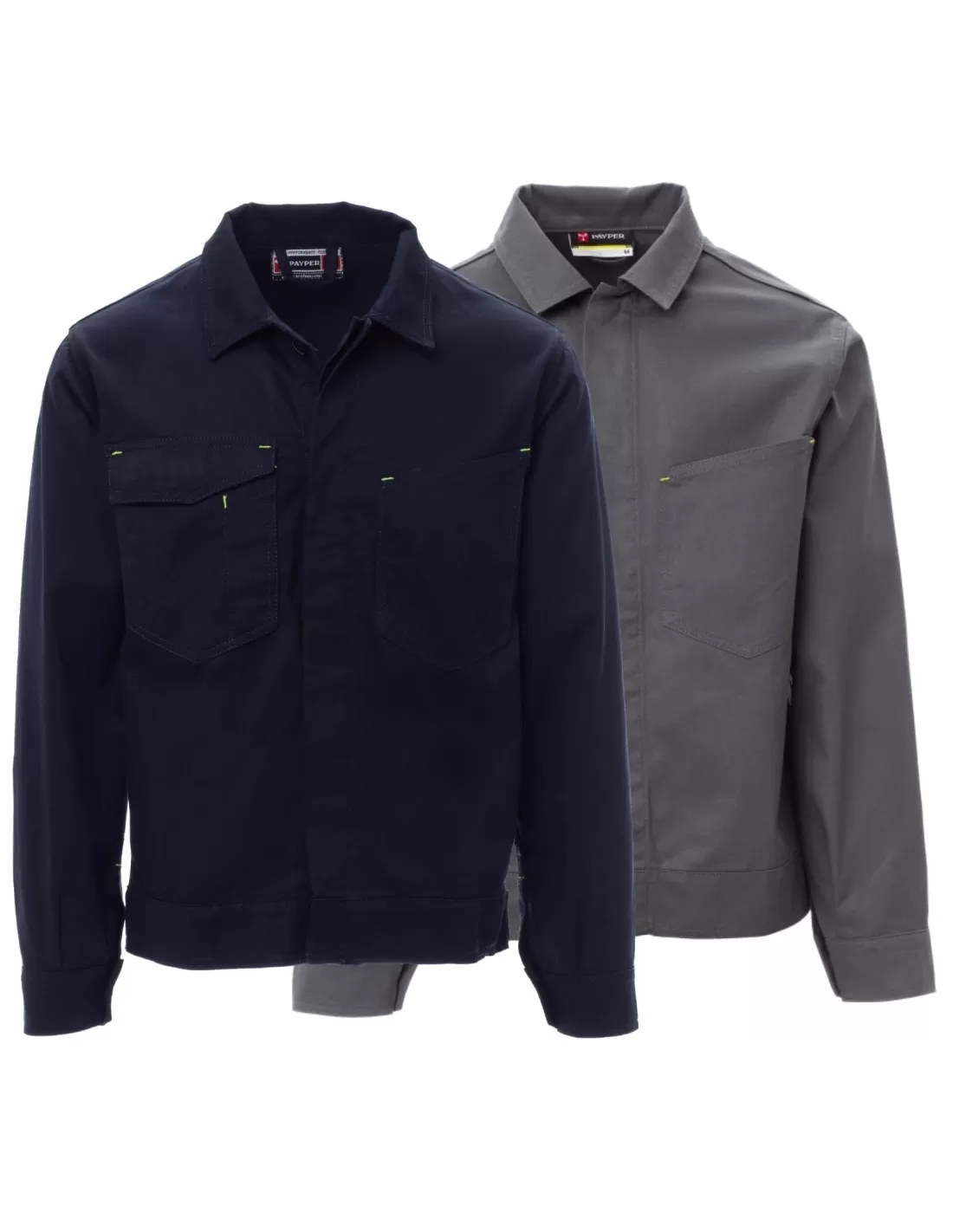 Giubbino taglio slanciato modello jeans, chiusura frontale, con bottoni in plastica coperti; due tasche al petto di cui una con porta smartphone, porta badge, porta penna e patta di chiusura con velcro; chiusura al polso con bottone e vita regolabile con velcro.