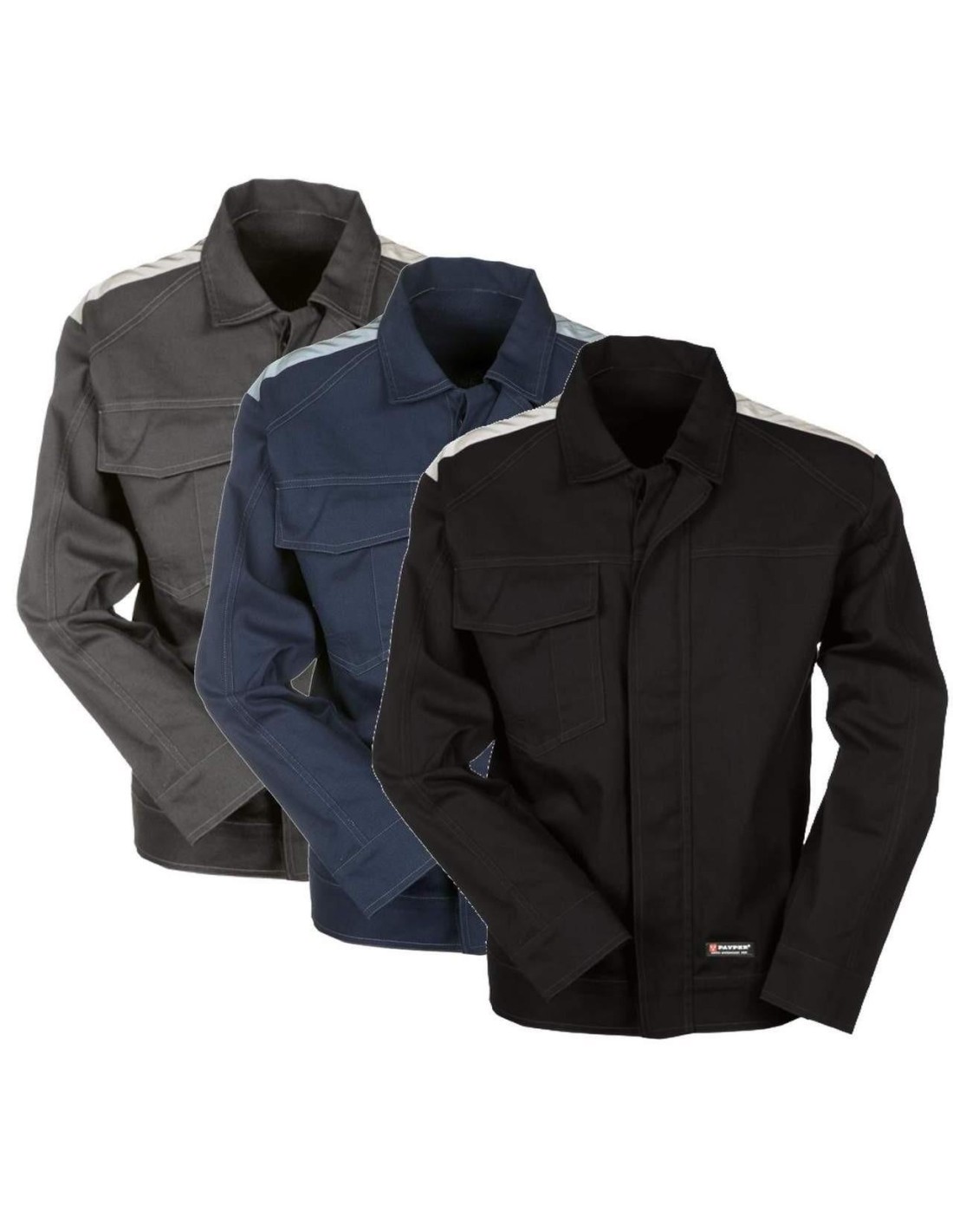 Giubbino con impunture a contrasto, inserti riflettenti su spalle e schiena; taglio slanciato modello jeans e chiusura frontale con bottoni in plastica a scomparsa; porta smartphone, porta badge staccabile e porta penna nella tasca al petto con patta e chiusura con velcro. Chiusura polso con bottone e vita regolabile con velcro.