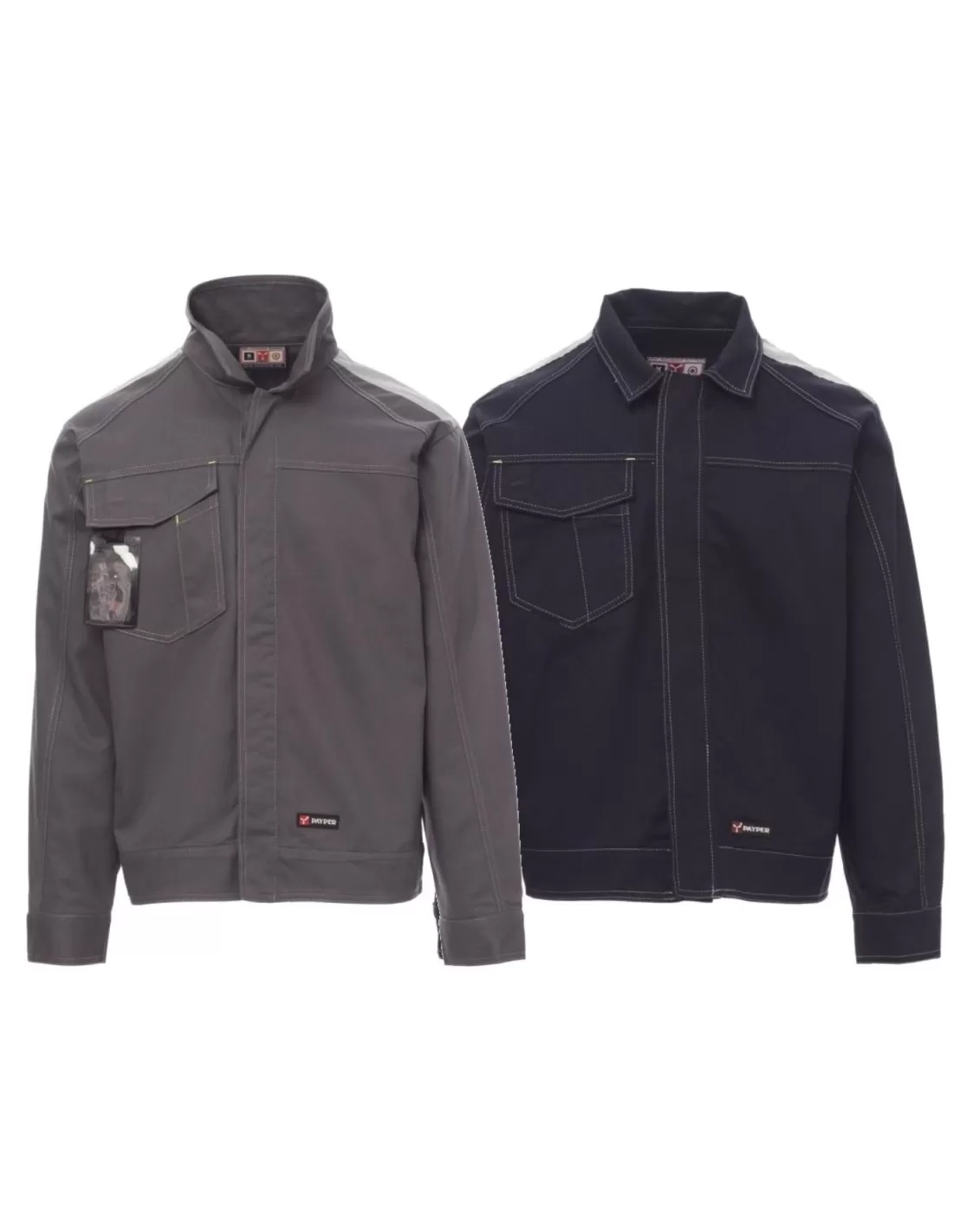 Giubbino invernale con impunture a contrasto, inserti riflettenti su spalle e schiena; taglio slanciato modello jeans e chiusura frontale con bottoni in plastica a scomparsa; porta smartphone, porta badge staccabile e porta penna nella tasca al petto con patta e chiusura con velcro. Chiusura polso con bottone e vita regolabile con velcro.