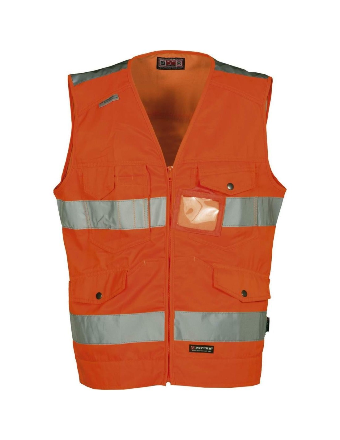 Gilet in alta visibilità a taglio slanciato modello jeans con bande 3M, chiusura frontale con zip, due tasche frontali modello canguro con patta di chiusura lock system e bottone in metallo, due tasche al petto di cui una lock system, porta badge staccabile e richiudibile, portacellulare.