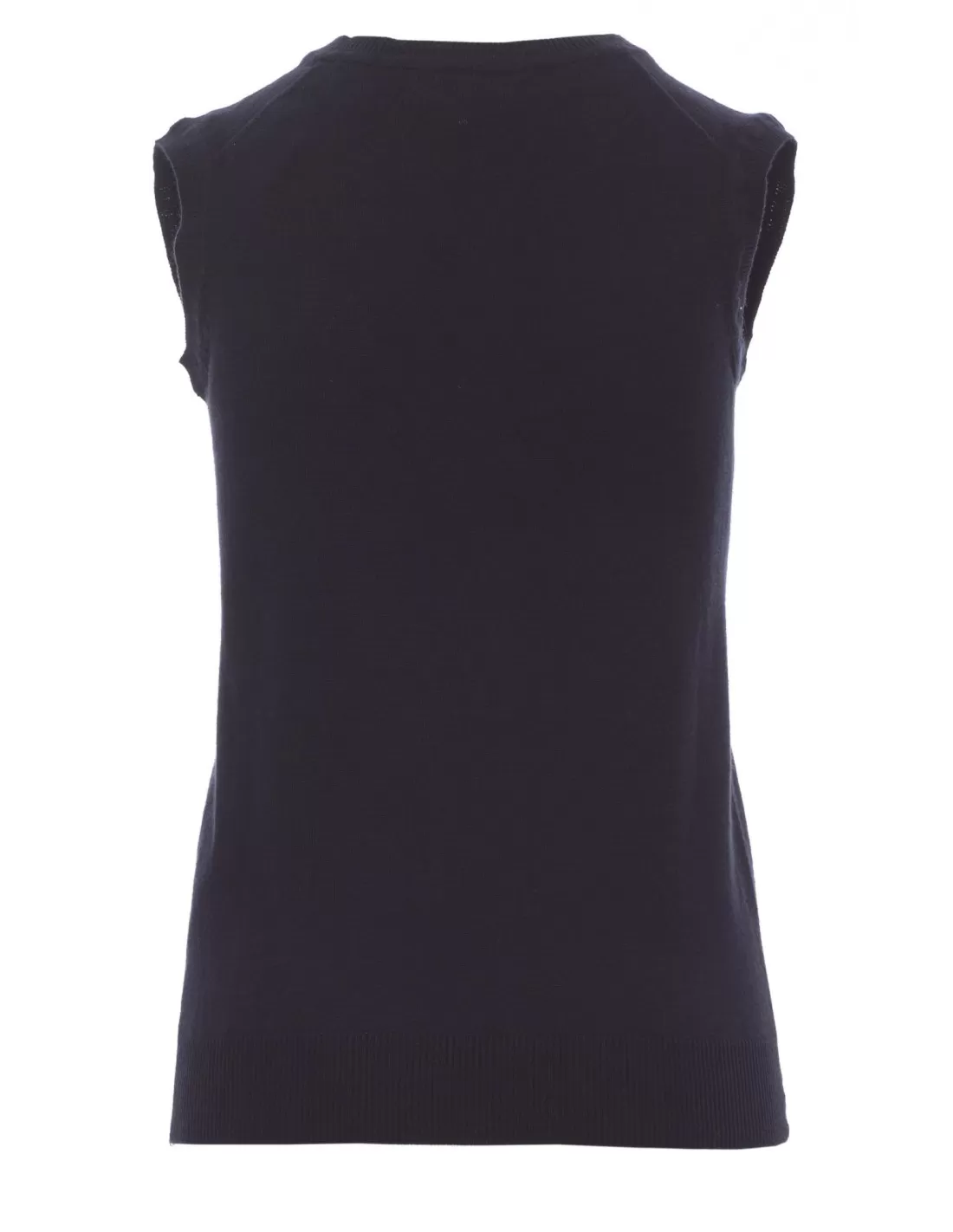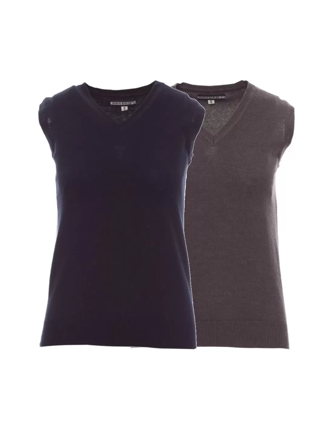 Gilet da donna con scollo a V, lavorazione a punto rasato fine, confezione a maglia calata senza cuciture, costine fini per il bordino collo, i giromanica e i bordi inferiori.