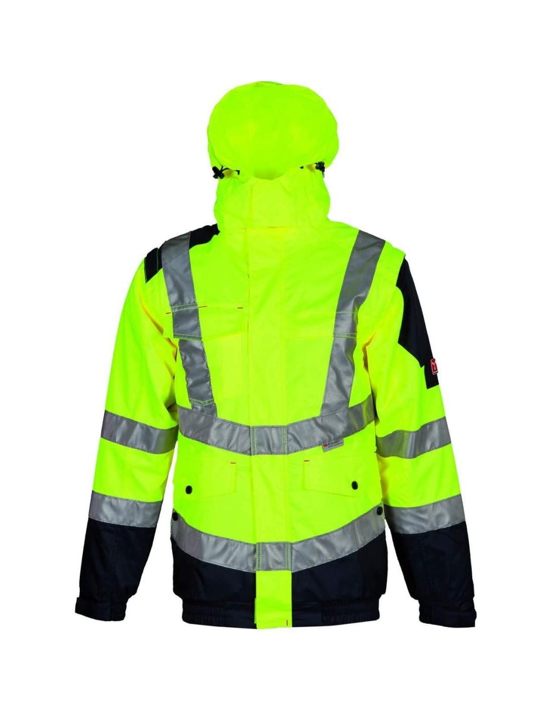 Giubbino bicolore con cappuccio a scomparsa, in alta visibilità, con bande 3M Scotchlite, elastico in vita, polsino regolabile elasticizzato, 4 ampie tasche frontali di cui 2 con cerniera, una tasca al petto con porta penne e porta badge a scomparsa.