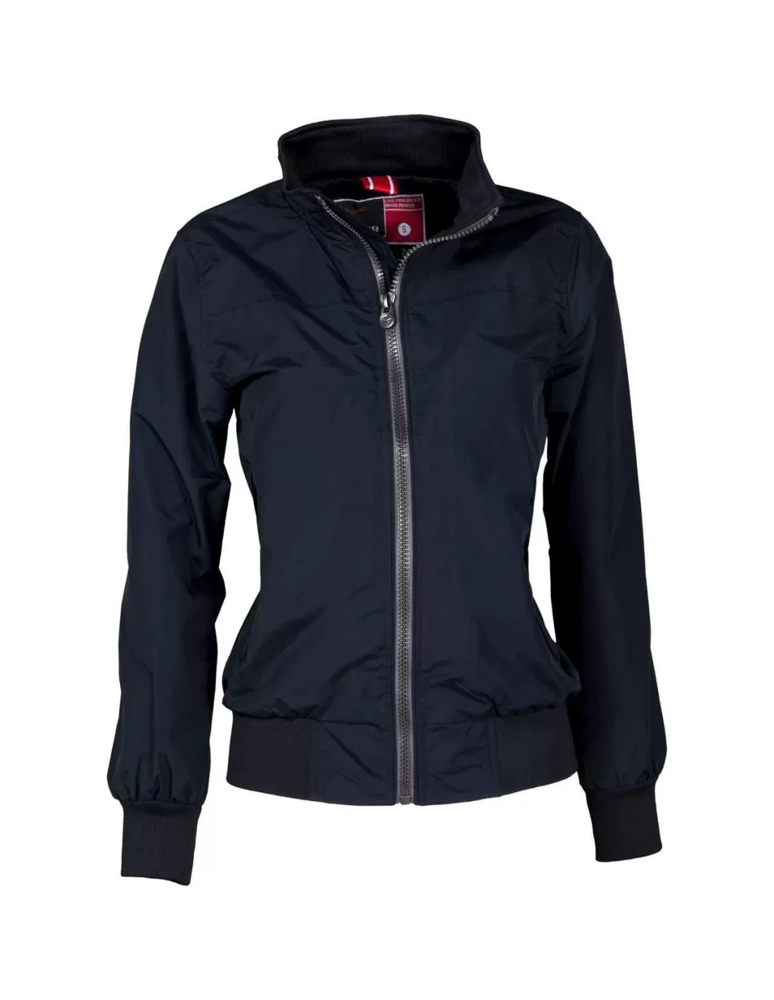 Giubbino da donna con rib elasticizzato in vita e ai polsi, due tasche esterne con zip coperta; interno, non imbottito, retinato, 1 tasca interna porta smartphone con cerniera e passaggio per cuffie, zip sul fondo per agevolare stampe e ricami.