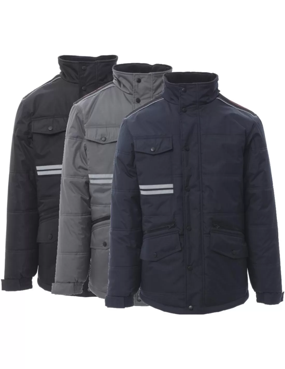 Giubbino a 3/4 da uomo, zip 8mm in plastica con cursore in metallo con patta e bottoni in plastica, retro sagomato e con cappuccio richiudibile nel colletto, due tasche esterne LOCK SYSTEM e due con zip, inclinazione delle tasche per agevolare l'ingresso della mano, una tasca al petto porta smart phone e anella porta badge, bande riflettenti sulla tasca e schiena. Interno: imbottito, pile in contrasto su schiena e collo , una tasca, zip interna per agevolare stampe e ricami.