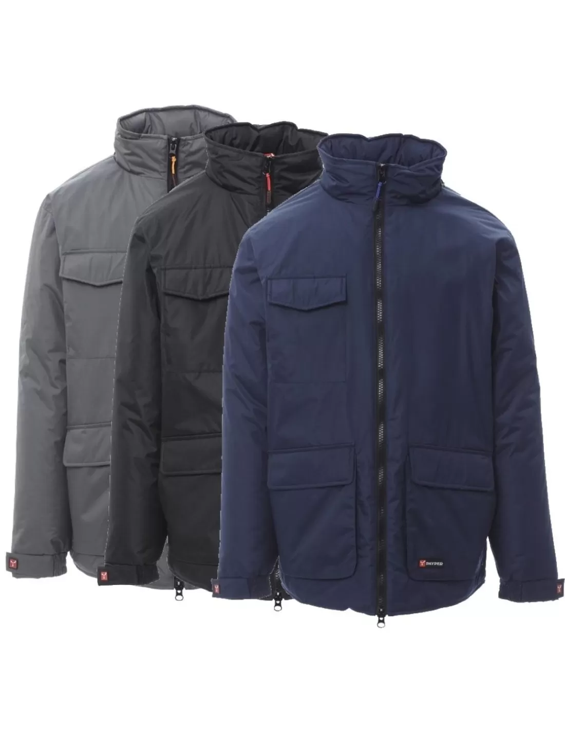 Giubbino a 3/4 da uomo, zip 8mm in plastica con cursore in metallo, cappuccio richiudibile nel colletto, elastico e stringi polsi, due ampie tasche frontali LOCK-SYSTEM, due tasche laterali, porta cellulare al petto. Interno: imbottito, zip per agevolare stampe e ricami.