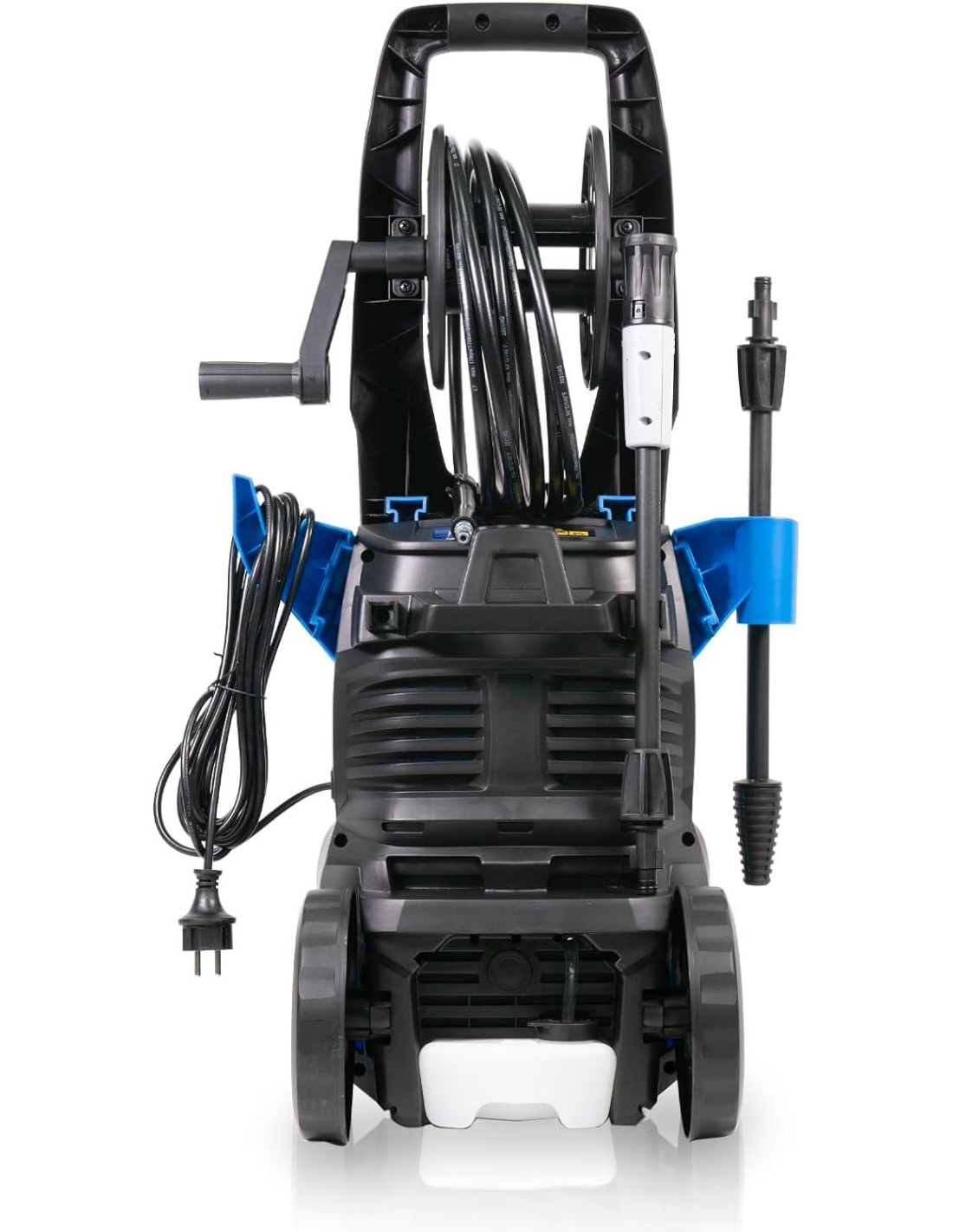 Pompa assiale con 3 pistoni in acciaio Il pulitore viene fornito con una lancia regolabile, un filtro per l'acqua, un serbatoio per il detergente e un avvolgicavo.