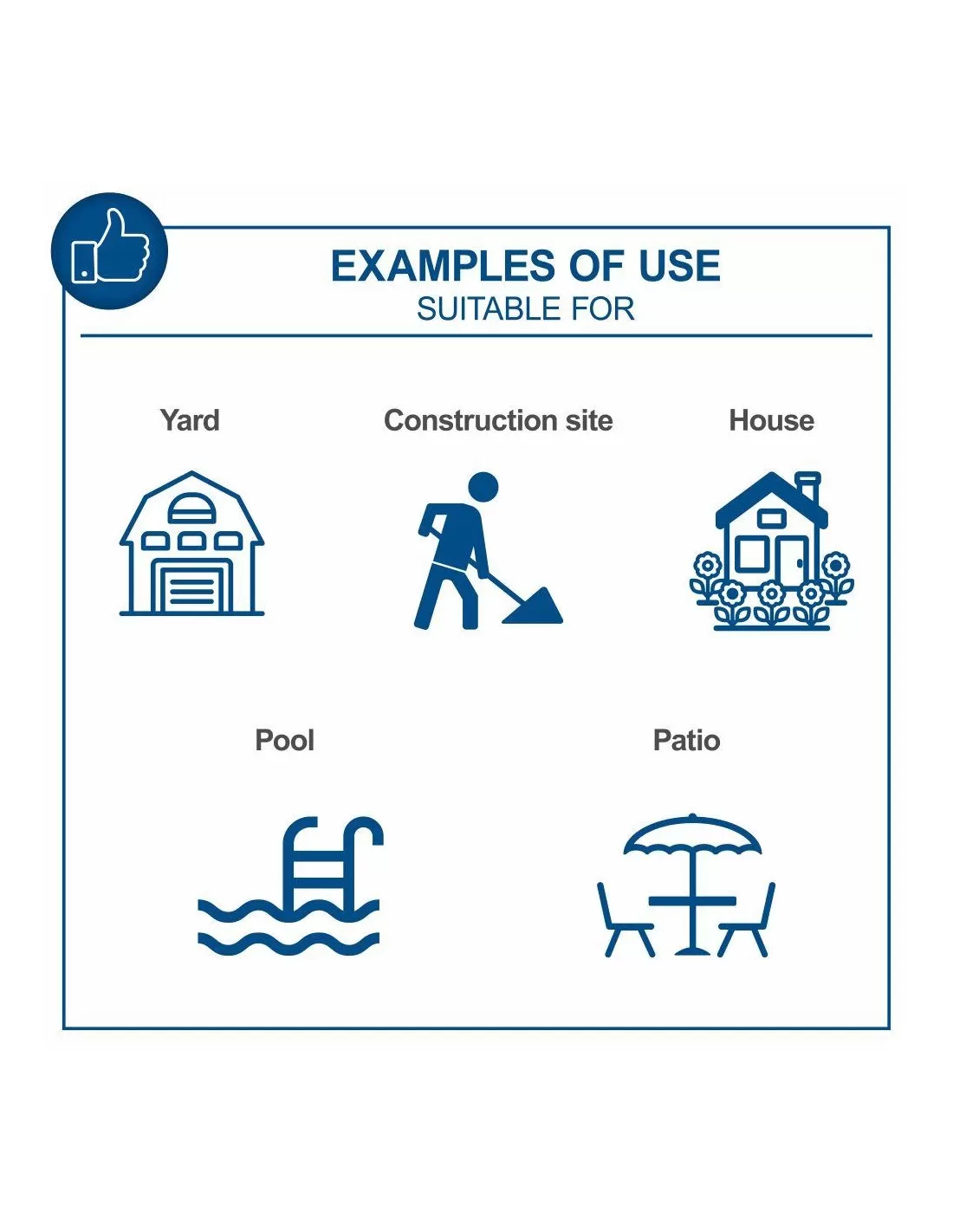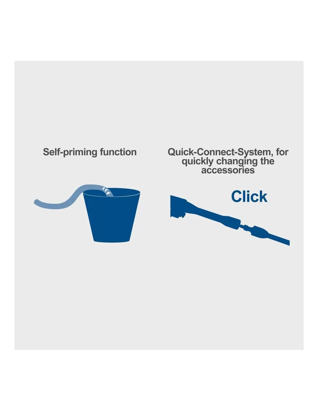 Con una portata di 408 litri all'ora sono possibili adeguate operazioni di pulizia. L'acqua viene fornita tramite un collegamento per tubo da giardino. E' possibile utilizzare anche acqua calda fino a 50 °C.