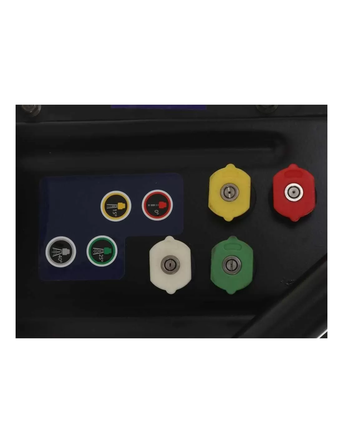 Ideale per la pulizia di automobili, muri o mobili da giardino, la confezione include un filtro dell'acqua, una lancia regolabile con blocco di sicurezza, una lancia turbo e 5 ugelli diversi: uno per detergente e altri quattro da 0, 15, 25 e 40°.