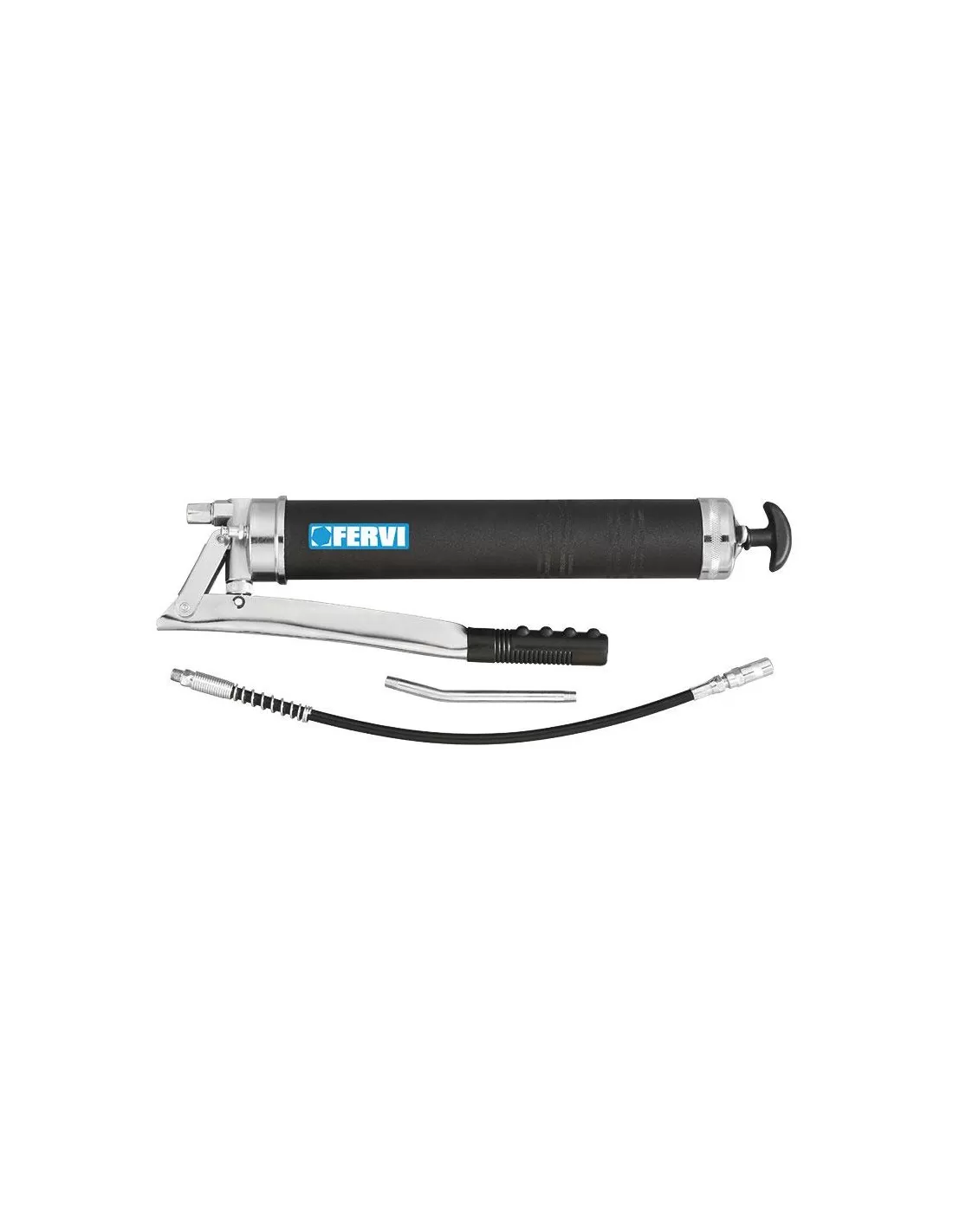 Composto da serbatoio e pompa in metallo, testina regolabile e tubo flessibile in PVC di 450mm, per utilizzo cartucce di grasso di ø 55mm o grasso sfuso (adattatore fornito montato).