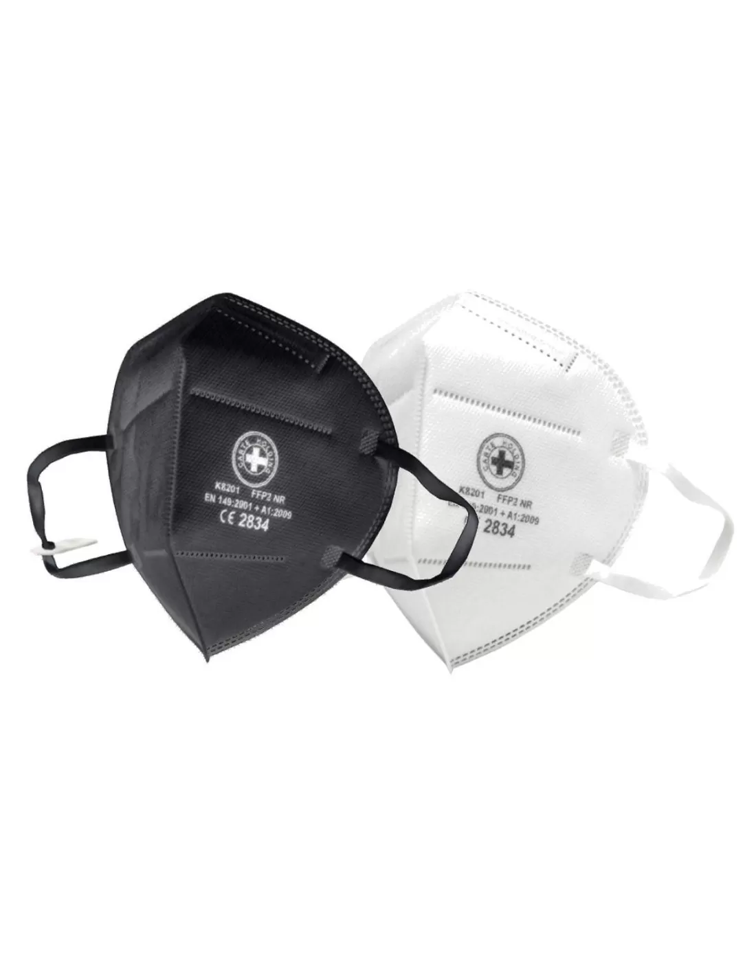 Semimaschera facciale filtrante antipolvere FFP2 NR, pieghevole, con ferretto (o nasello) al naso ed elastici con gancio per allaccio dietro nuca. Scatole da 20 pezzi, confezionati a coppia in una busta.