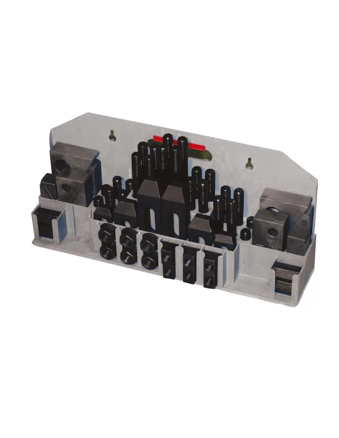 Set da 52 pezzi. Scanalatura a T da 14 mm. Filettatura barra di trazione M12. Montaggio a parete. 6 dadi per scanalature a T. 6 dadi flangiati. 4 dadi di raccordo. 6 blocchi di serraggio. 6 morsetti di serraggio. 24 perni filettati: 4 x 3", 4", 5", 6", 7", 8".