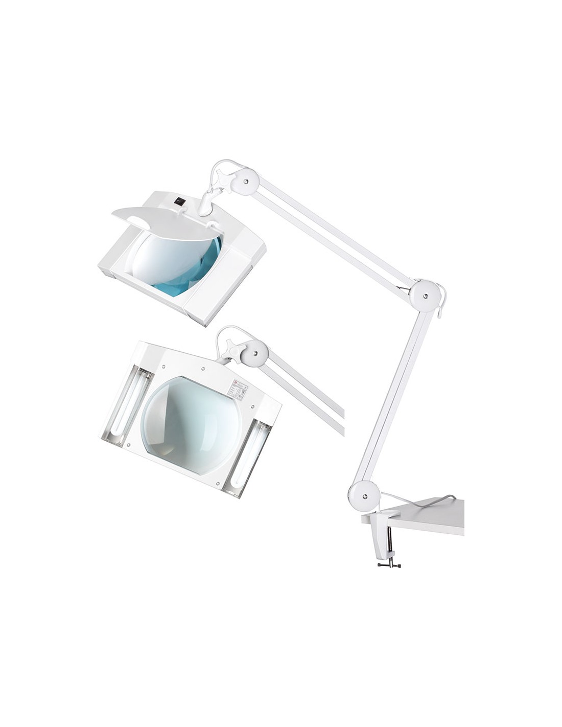 Lampada snodata con lente d'ingrandimento e morsetto. Ideale per casa, ufficio, studio, officina.