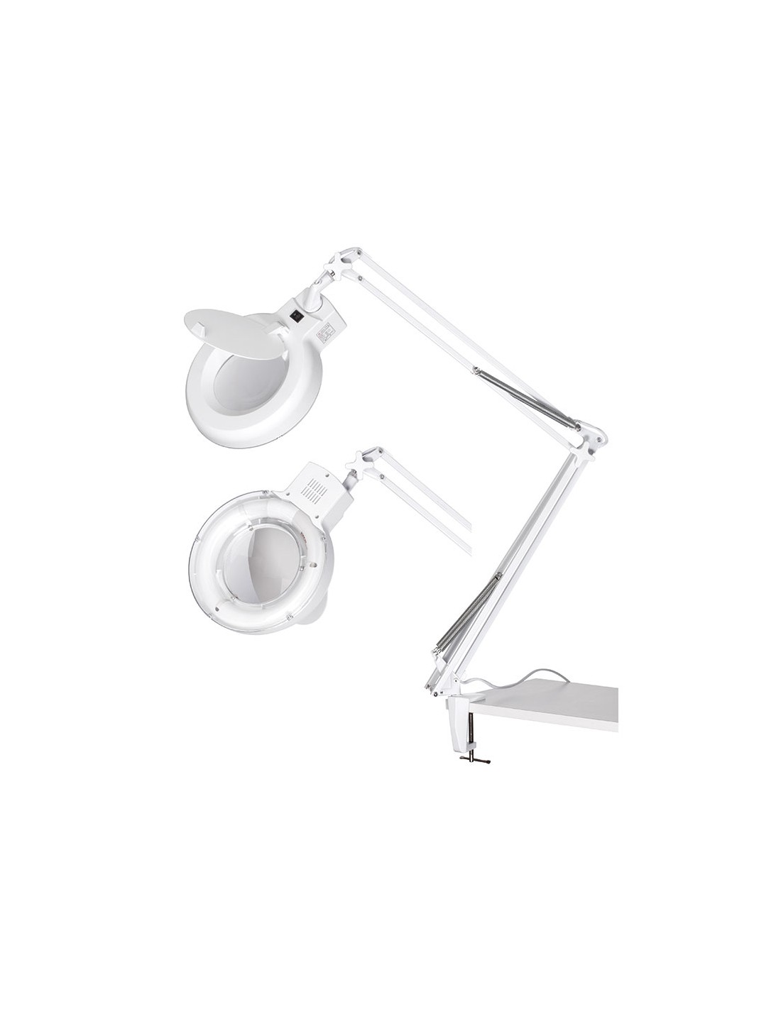 Lampada snodata con lente d'ingrandimento e morsetto. Ideale per casa, ufficio, studio, officina.