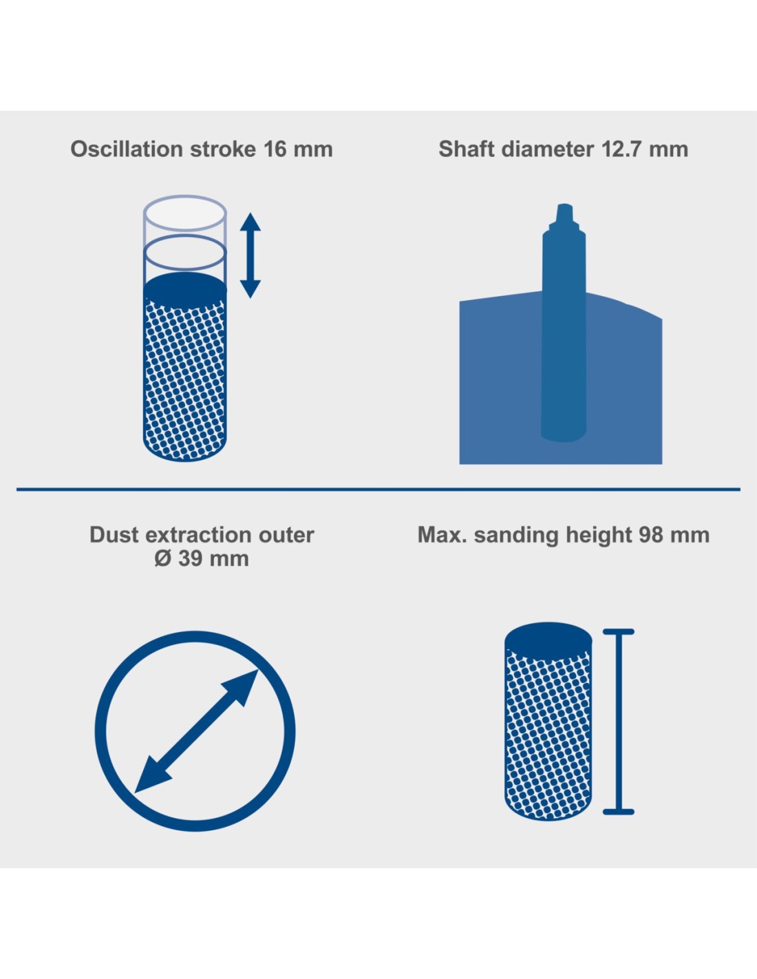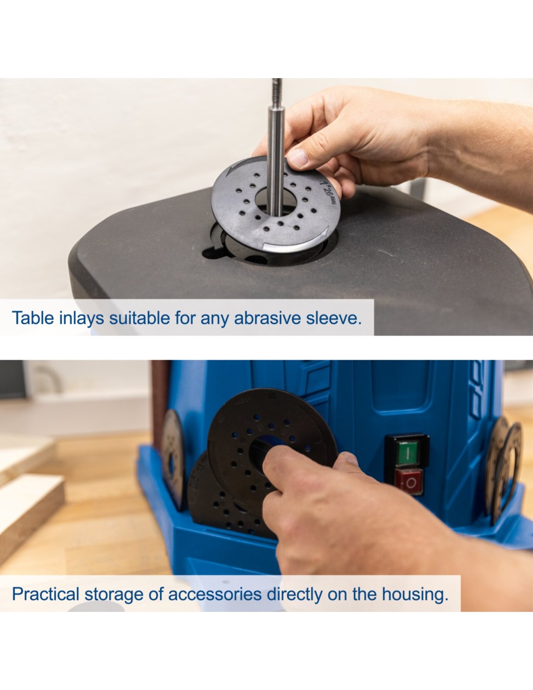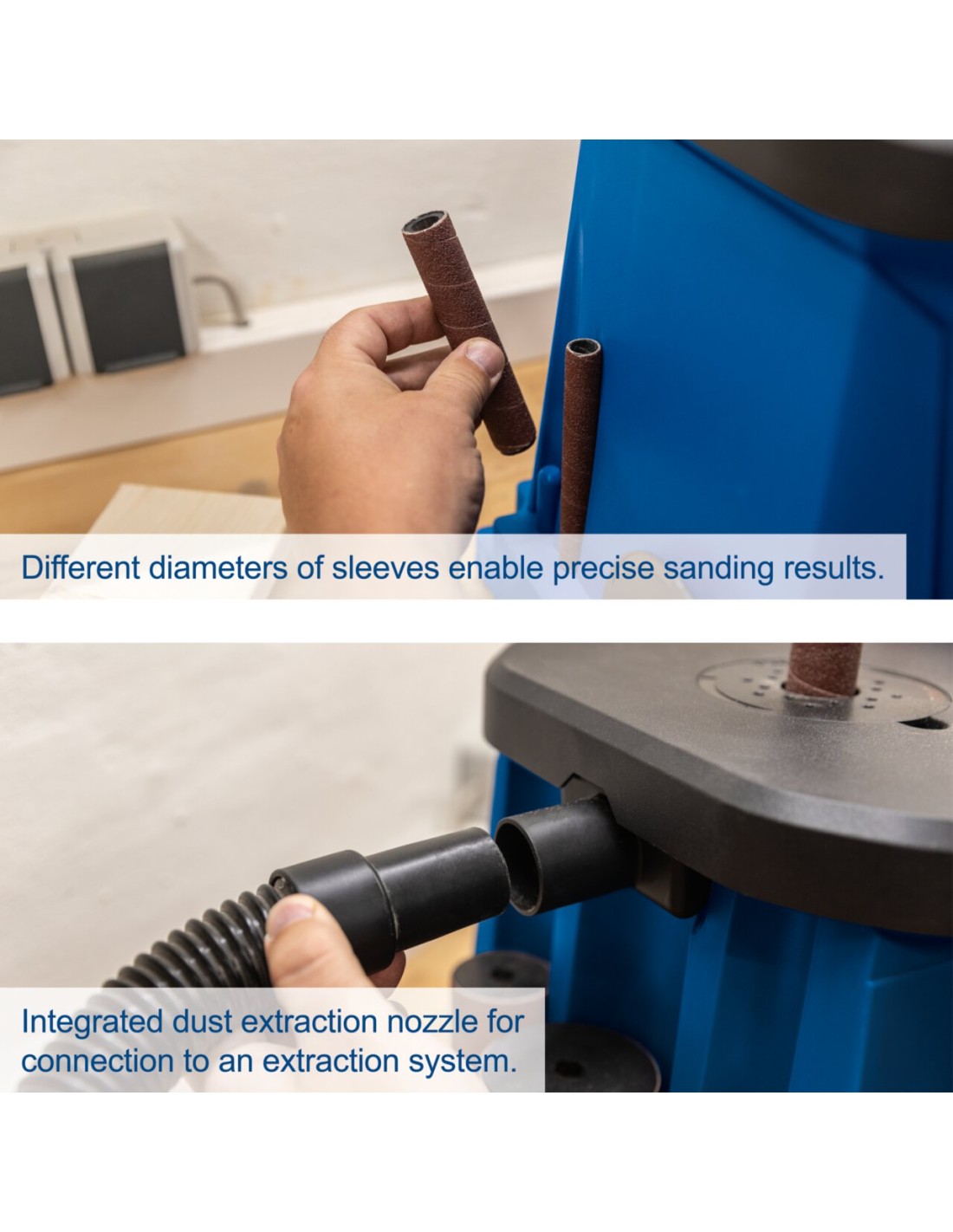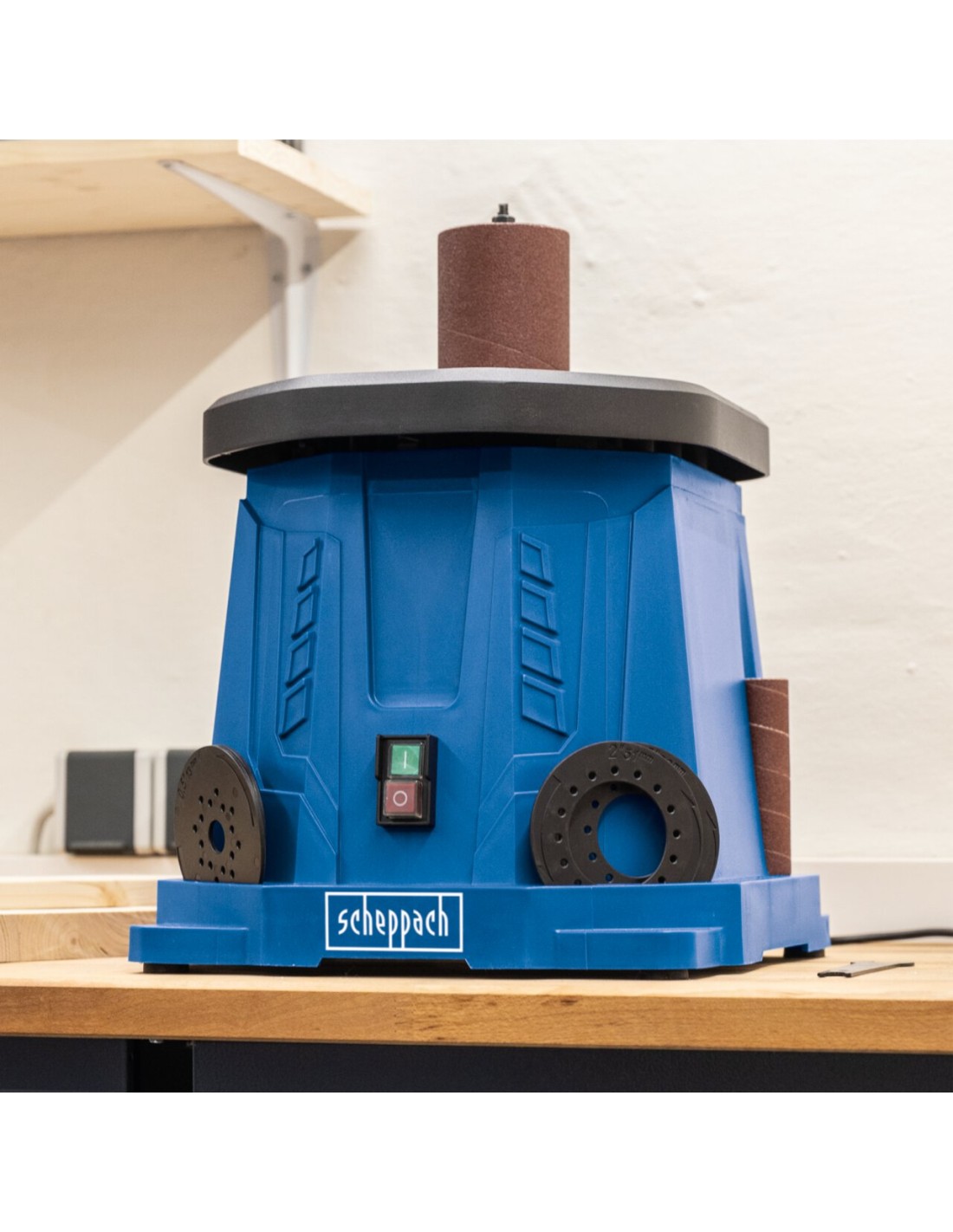 OSCILLANTE RETTIFICATRICE PER MANDRINI • Compatto e leggero per un comodo trasporto • Potente motore da 450 W con potenza sufficiente per tutti i materiali in legno • Mandrino rotante e oscillante per superfici di rettifica lisce e Lavoro di dettaglio preciso • Ampio e solido tavolo in alluminio pressofuso per la massima precisione e Stabilità, anche nella lavorazione di pezzi più grandi • L'ugello di aspirazione della polvere integrato per il collegamento a un sistema di aspirazione garantisce per lavorare in sicurezza • Include 6 manicotti abrasivi con diametri di 13, 19, 26, 38, 51 e 76 mm, rulli in gomma abbinati e 6 inserti tavola • Possibilità di riporre accessori e strumenti di montaggio lateralmente • Interruttore on/off facile da raggiungere e a prova di polvere