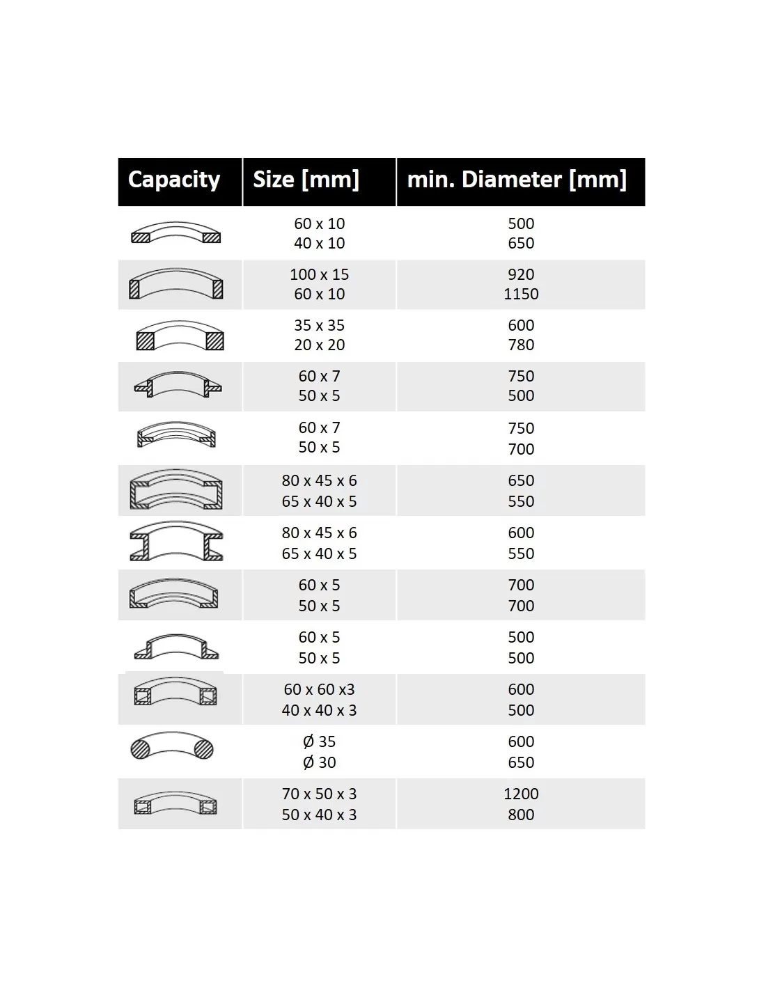Raggio di curvatura regolabile tramite dispositivo di avanzamento superiore con scala a nonio. Adatto per la curvatura di profili e tubi. Molte diverse geometrie di profilo possono essere curvate utilizzando rulli universali. Peso proprio molto elevato per una stabilità ottimale, rulli di raddrizzamento laterali rettificati e temprati. Rulli di curvatura in acciaio resistente e temprato. Comando a pedale, rotazione sinistra-destra.
