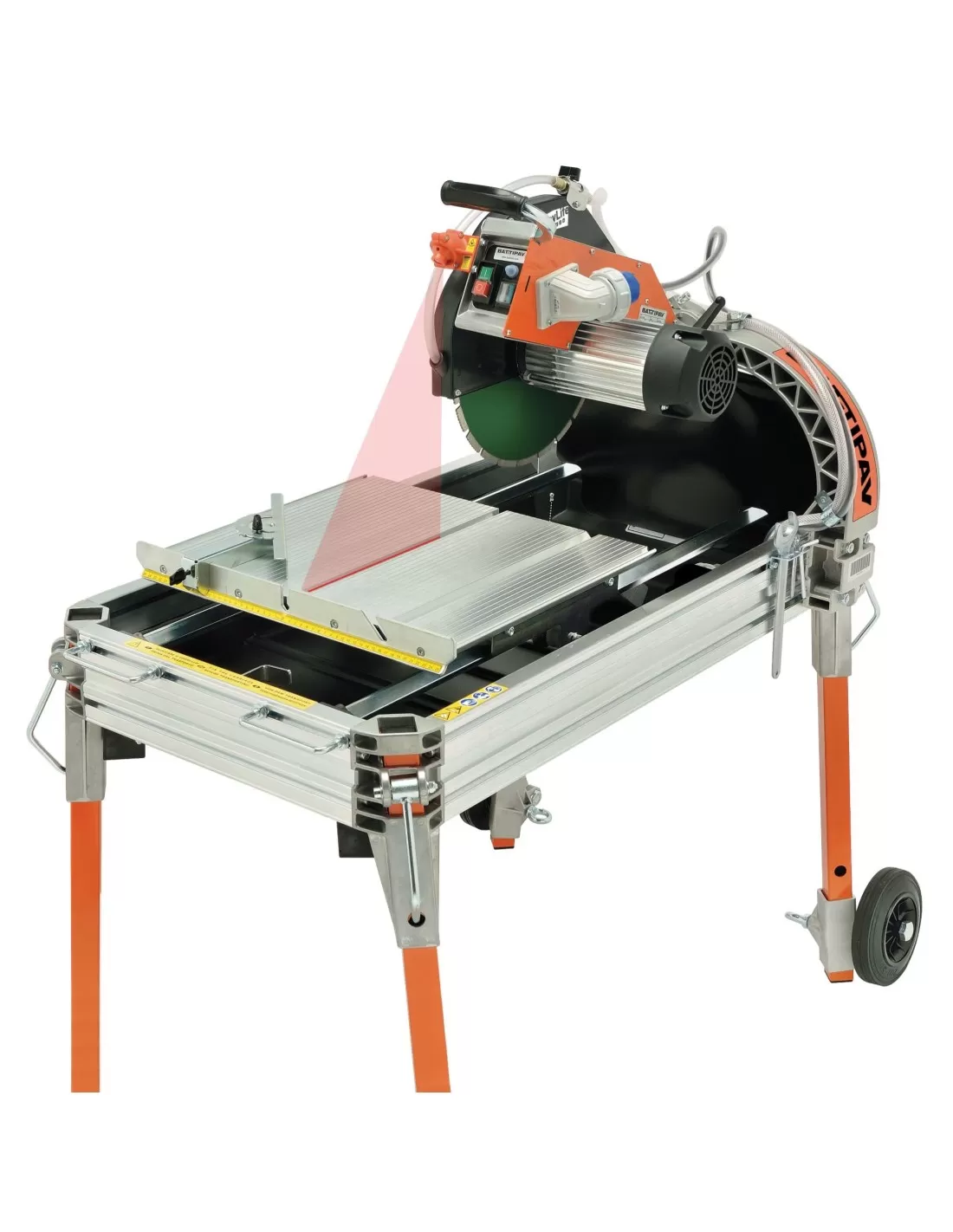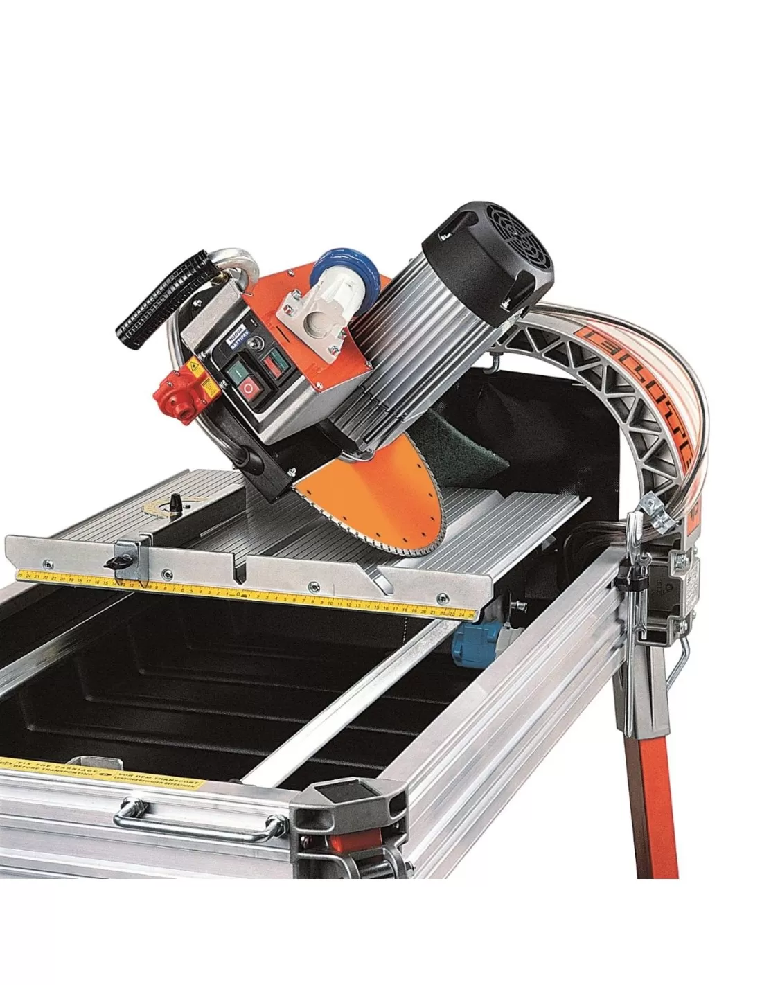 È dotata di un piano di lavoro scorrevole e testa di taglio basculante. Il piano di lavoro è in trafilato di alluminio provvisto di scanalature con interasse 10 mm la cui misura corrisponde a quella dell’asta graduata posta sulla battuta di appoggio. Il carrello è dotato di 6 ruote in nylon registrabili con 12 cuscinetti a sfera per una perfetta scorrevolezza. La struttura in alluminio trafilato permette di avere il massimo della solidità e, nel contempo, leggerezza. Provvista di quattro maniglie per il trasporto e la movimentazione. Costruita per ridurre al minimo l’ingombro durante il trasporto e soprattutto lo spazio di stoccaggio, dotata di ruote.