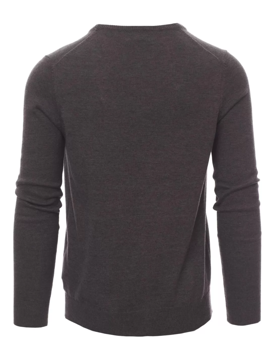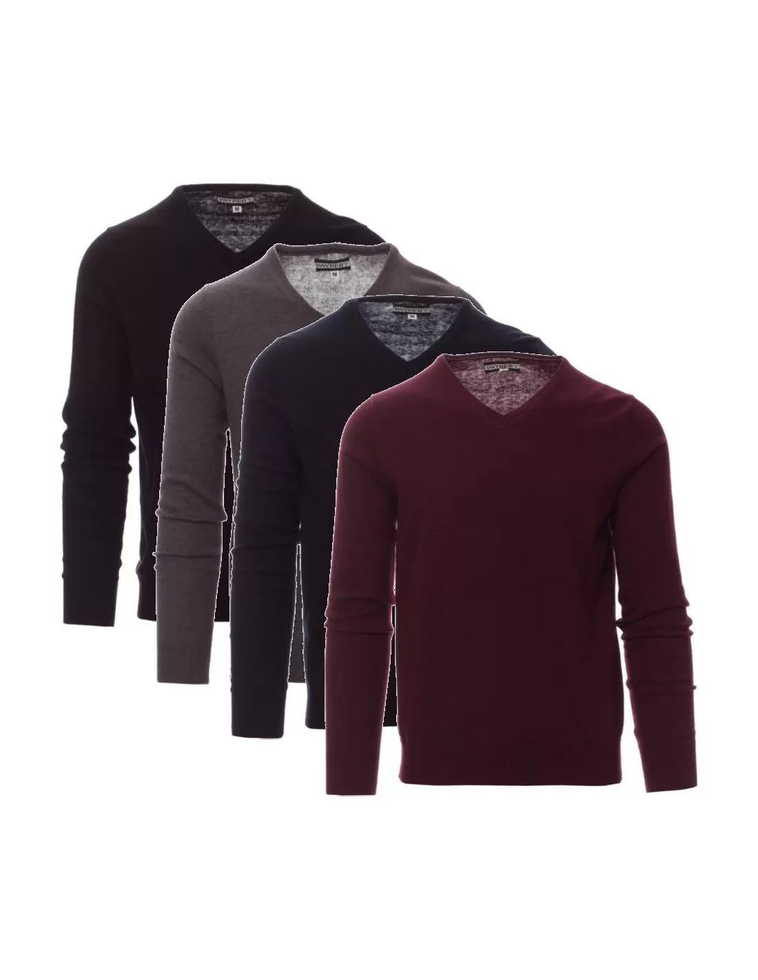 Maglioncino da uomo con scollo a V, lavorazione a punto rasato fine, confezione a maglia calata senza cuciture, costine fini per il bordino collo, per i polsi e i bordi inferiori.