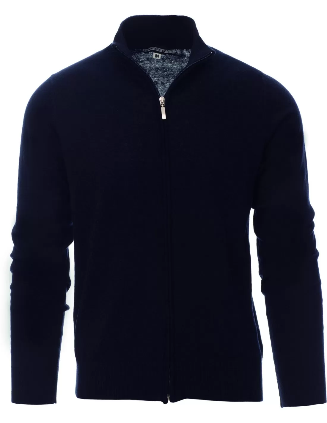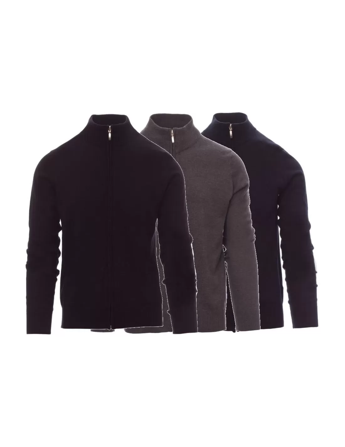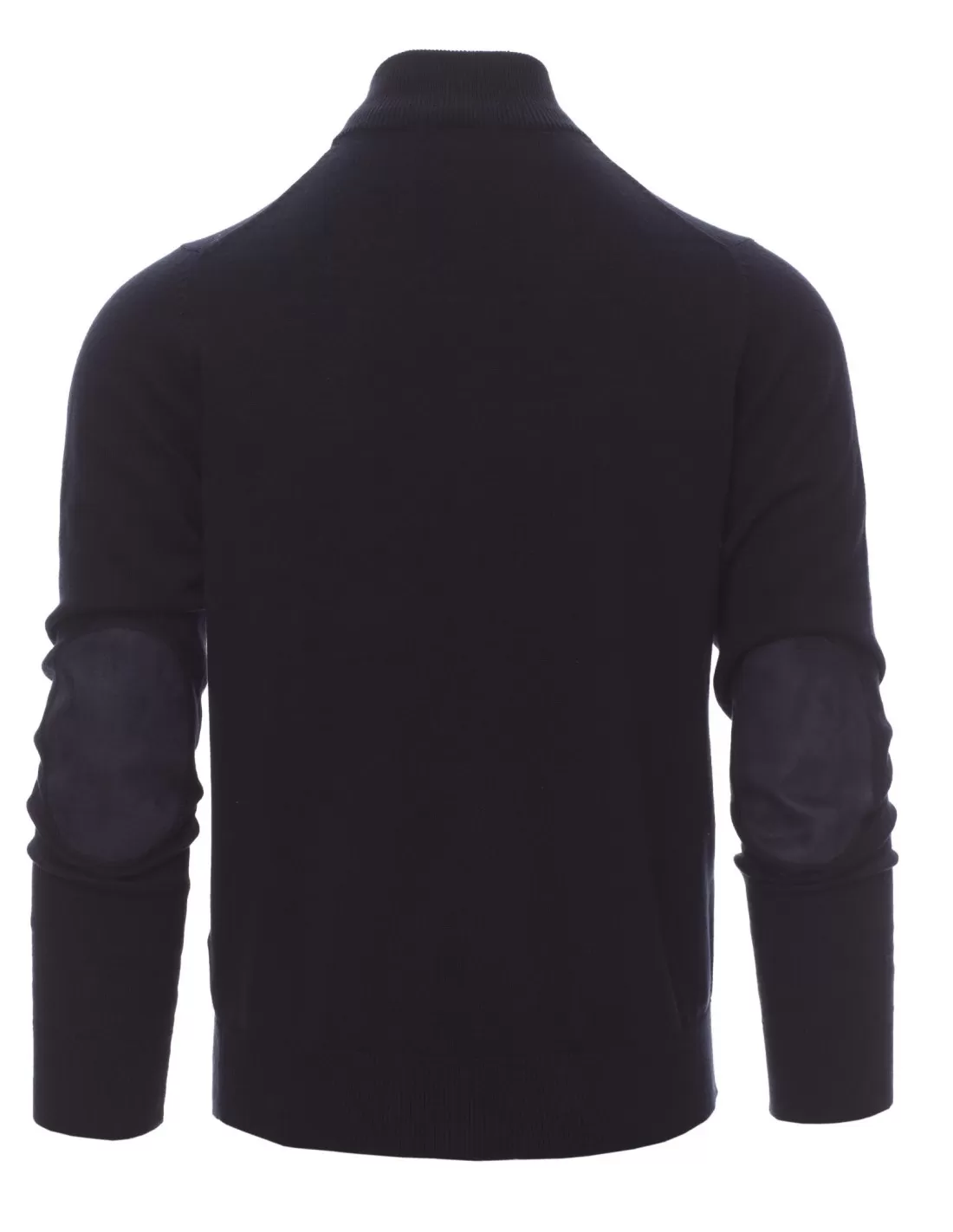 Maglioncino unisex a zip intera, lavorazione a punto rasato fine, confezione a maglia calata senza cuciture, costine fini per il collo, per i polsi e i bordi inferiori, con toppe ai gomiti.