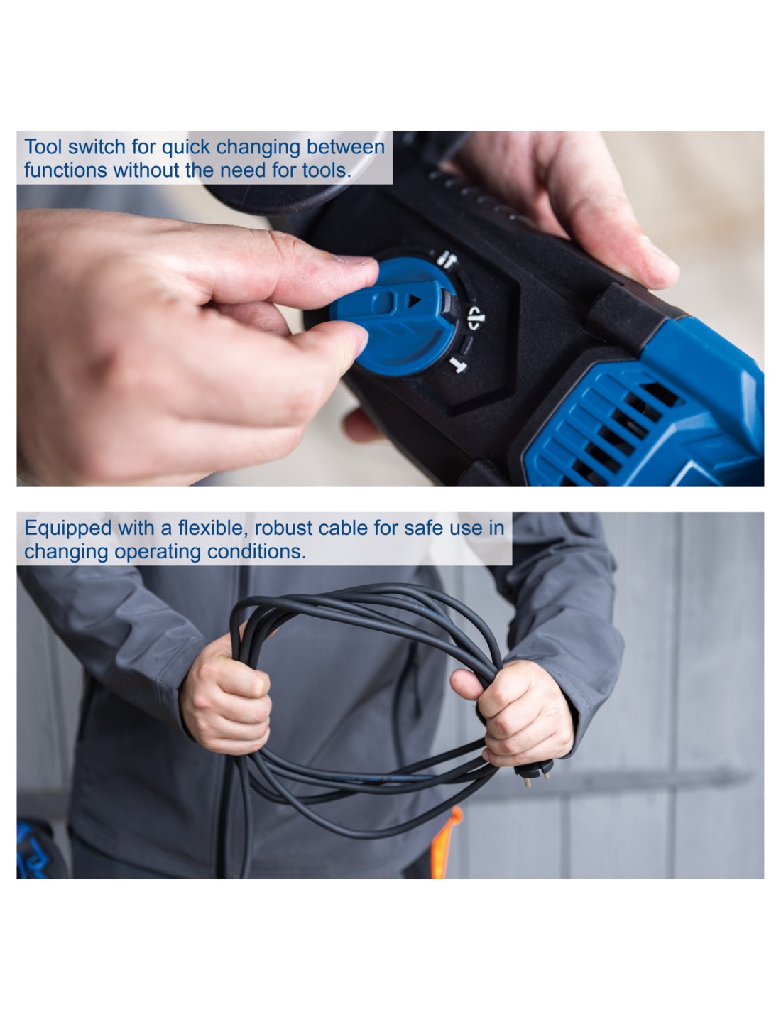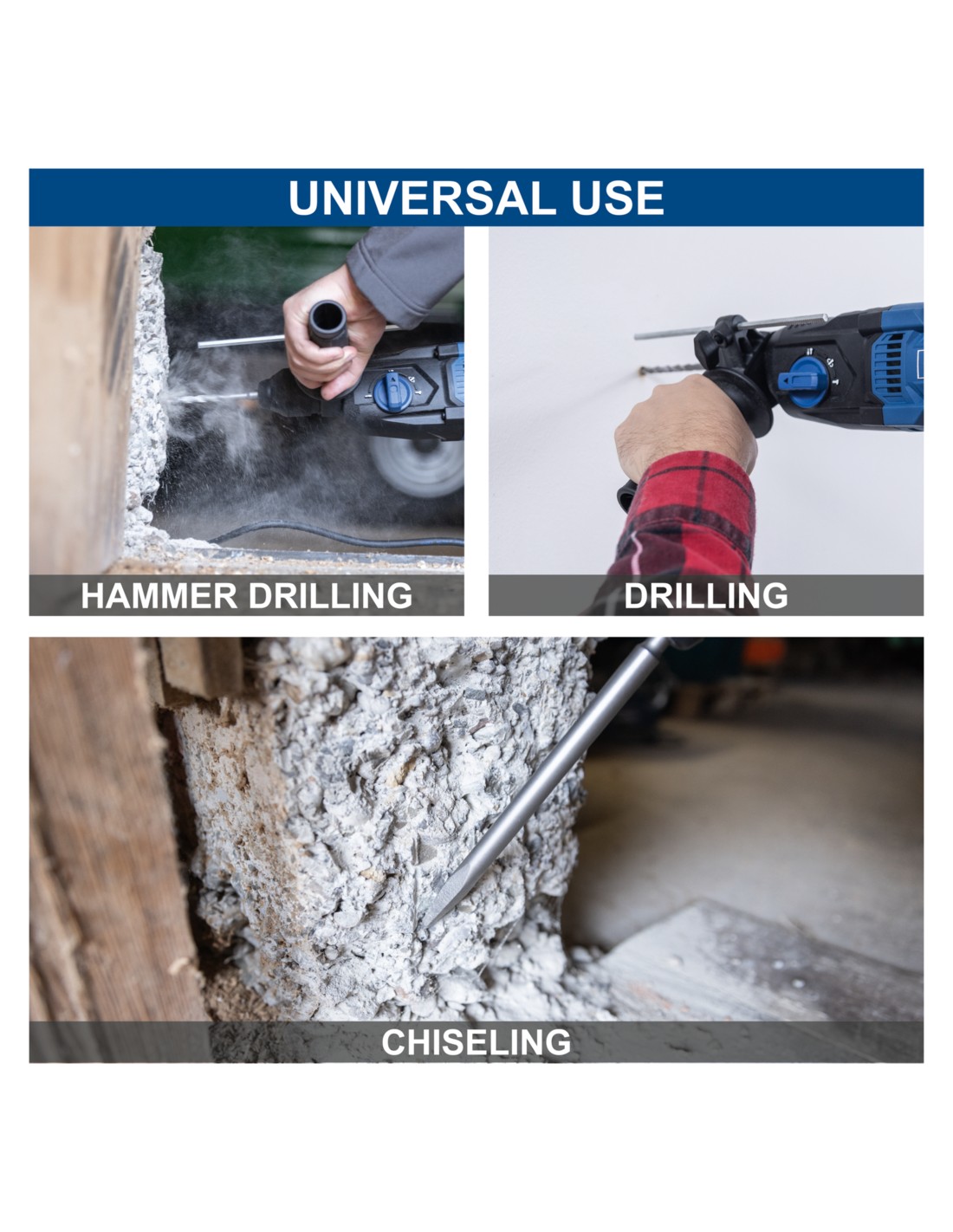 • Potente trapano a percussione con funzione 4 in 1: foratura, foratura a percussione, scalpellatura e regolazione della posizione dello scalpello.