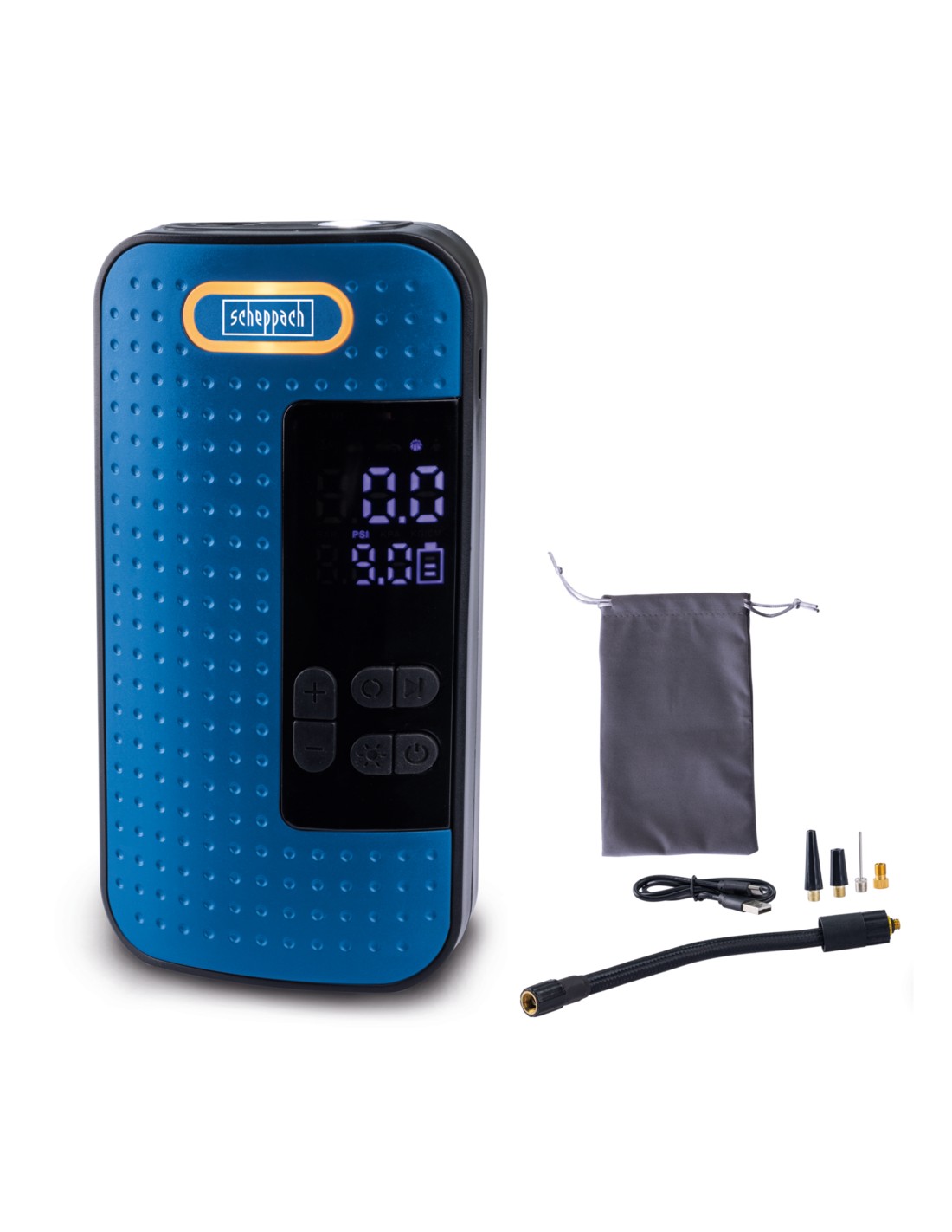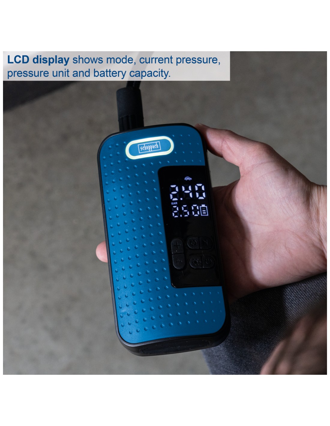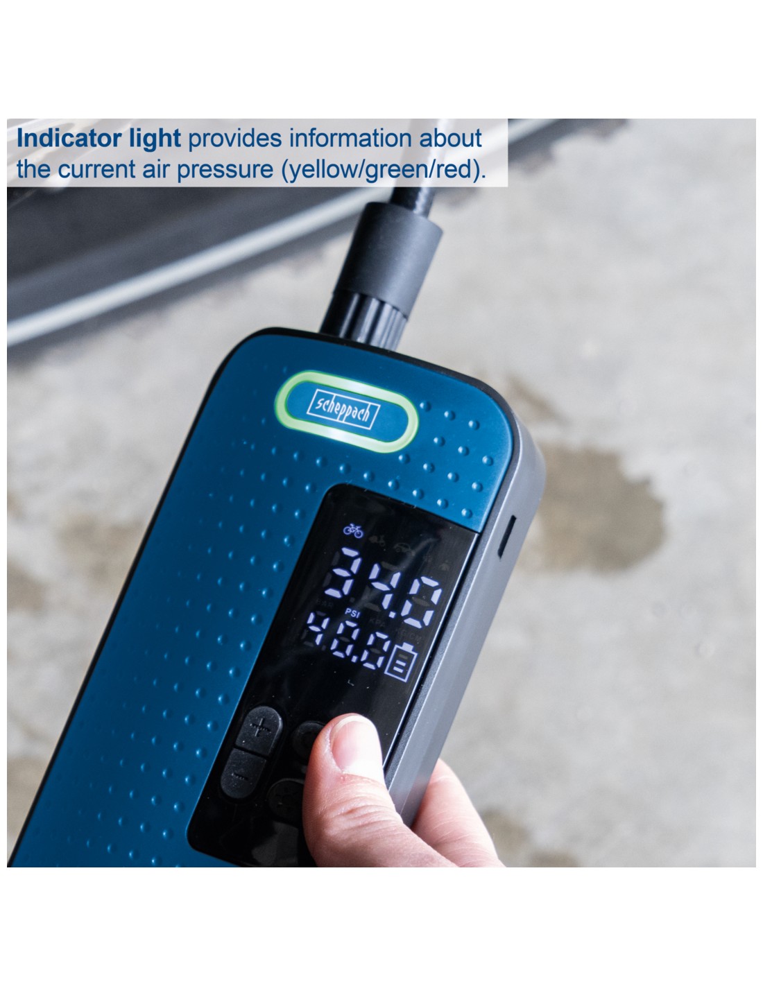Il compressore portatile senza fili Scheppach AC10/8V, con una pressione di esercizio massima di 10,3 bar, è uno strumento pratico e potente per gli spostamenti, ideale per gonfiare pneumatici di auto o biciclette, palloni e materassi ad aria. Il compressore compatto offre cinque modalità di funzionamento: modalità bicicletta, modalità moto, modalità auto, modalità palloni e modalità manuale. Il display LCD mostra la modalità selezionata, la pressione attuale, l'unità di misura della pressione e la capacità della batteria. Un indicatore luminoso aggiuntivo (giallo/verde/rosso) fornisce inoltre informazioni sulla pressione dell'aria attualmente misurata.