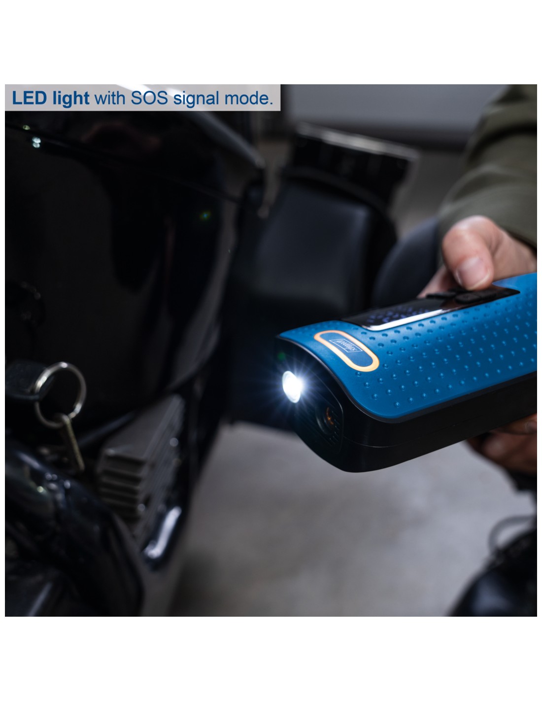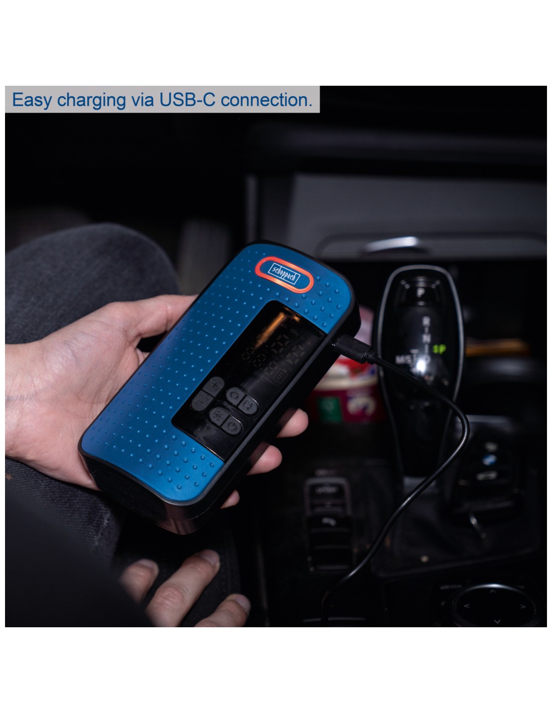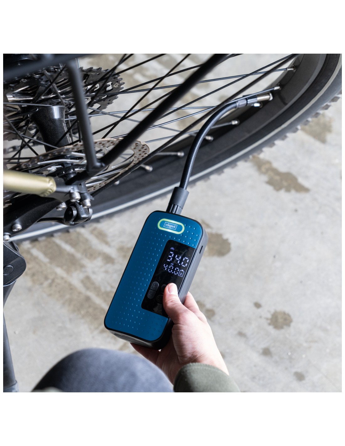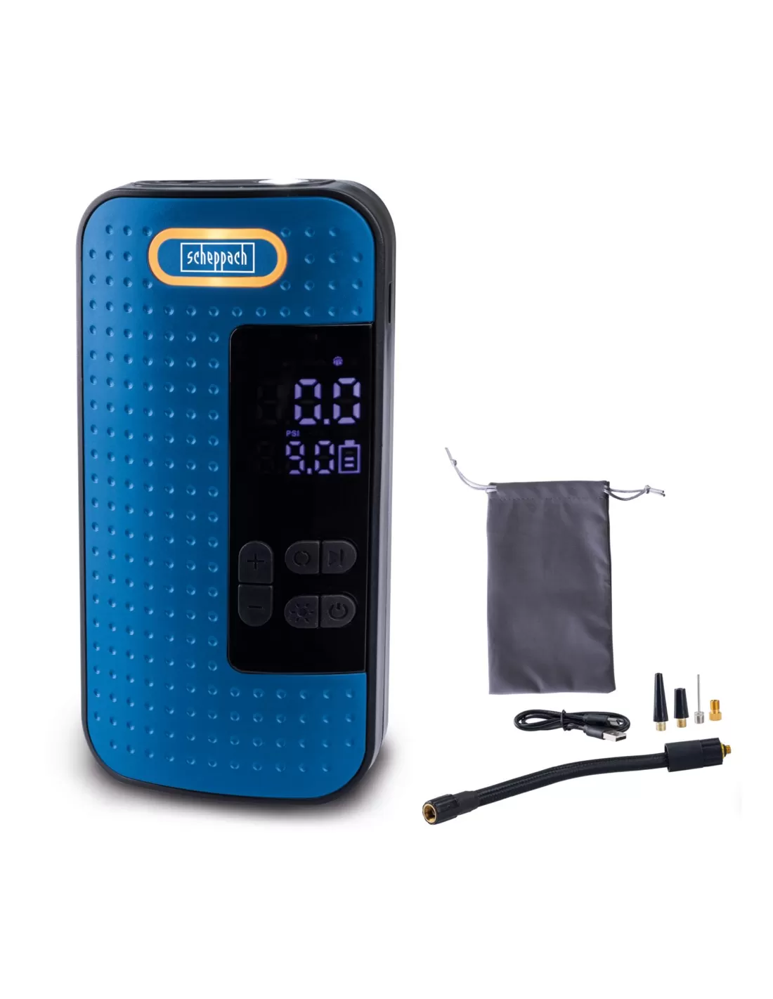 Il compressore portatile senza fili Scheppach AC10/8V, con una pressione di esercizio massima di 10,3 bar, è uno strumento pratico e potente per gli spostamenti, ideale per gonfiare pneumatici di auto o biciclette, palloni e materassi ad aria. Il compressore compatto offre cinque modalità di funzionamento: modalità bicicletta, modalità moto, modalità auto, modalità palloni e modalità manuale. Il display LCD mostra la modalità selezionata, la pressione attuale, l'unità di misura della pressione e la capacità della batteria. Un indicatore luminoso aggiuntivo (giallo/verde/rosso) fornisce inoltre informazioni sulla pressione dell'aria attualmente misurata.