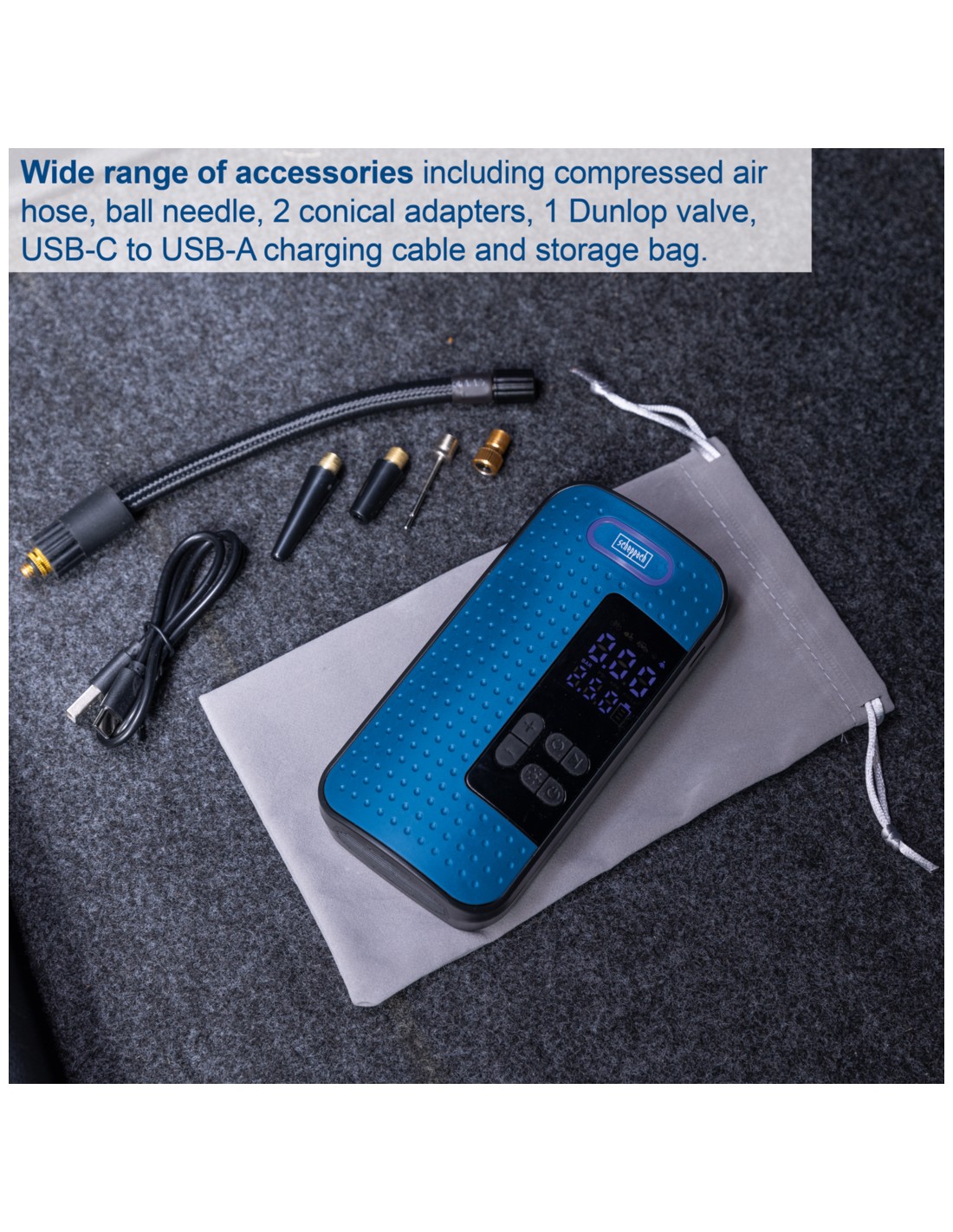 Include tubo dell'aria compressa, ago per pallone, 2 adattatori conici, 1 valvola Dunlop, cavo di ricarica da USB-C a USB-A, custodia