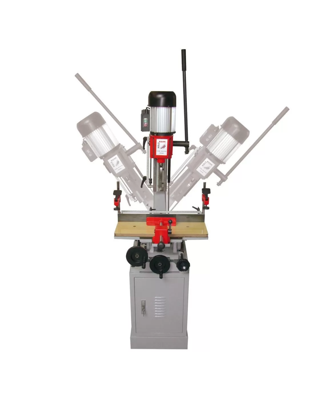 Telaio di base incluso. Guide a coda di rondine regolabili con precisione per la mortasatura di fori rettangolari. Ideale per la creazione di incastri a tenone in legno duro e tenero. Battute regolabili per una mortasatura ripetibile. Grandi volantini per una facile regolazione del piano di lavoro. Pratico utilizzo con una sola mano con servocomando tramite cilindri a gas. Solida struttura in ghisa dell'intera macchina. 2 morsetti eccentrici per il pezzo in lavorazione con regolazione rapida. Mobile di base con vano portautensili bloccabile e piedini in gomma. Altezza massima del pezzo in lavorazione: 210 mm. Altezza macchina: 1720 mm. Inclinazione del piano di lavoro di +/- 22,5°.