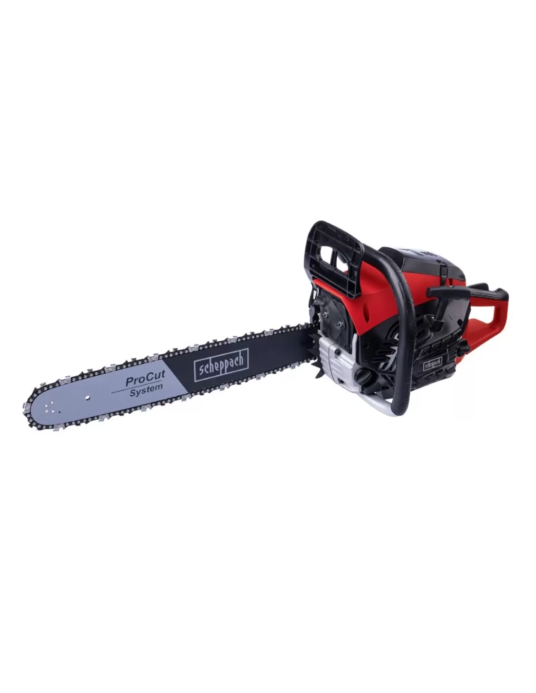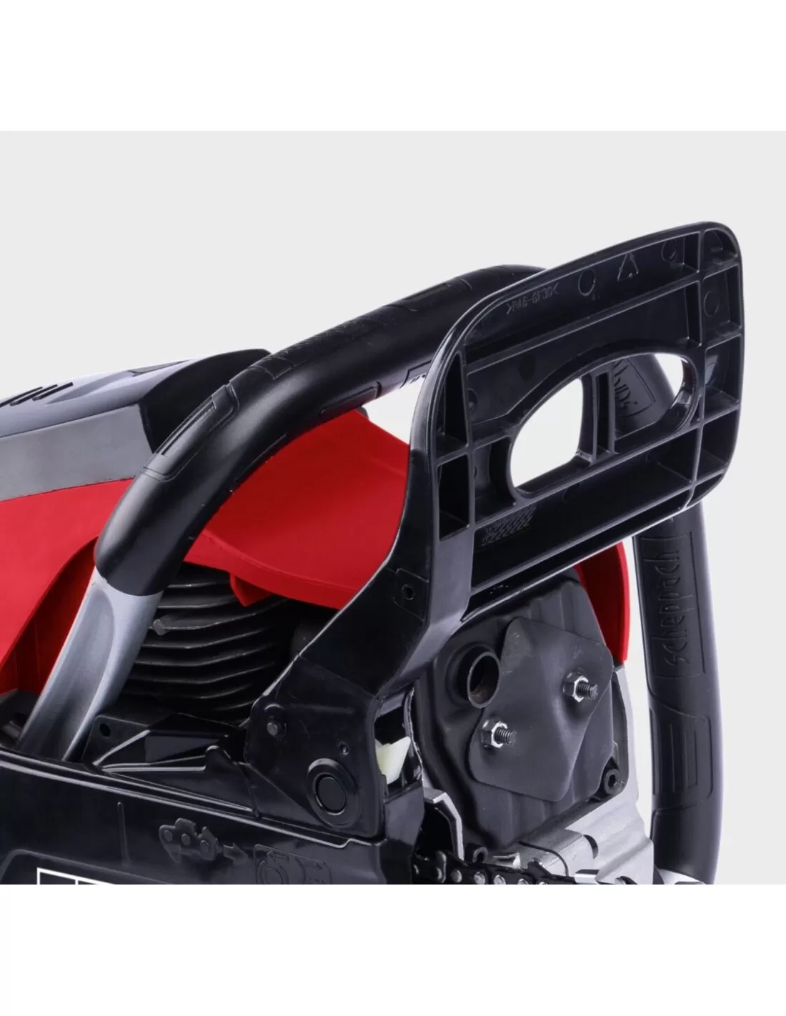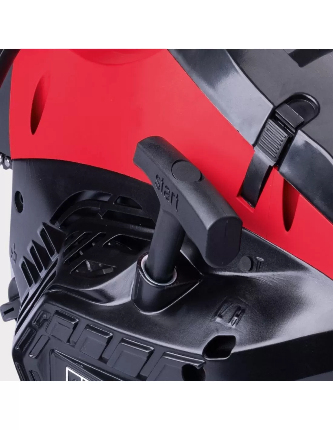 MOTOSEGA A BENZINA DA 45 CM • Potente motosega a benzina per il taglio di legna da ardere, potatura di arbusti, potatura di rami o cura del giardino • Motore a benzina a 2 tempi da 2,4 cavalli/1,8 kW ad alte prestazioni, 46 cc • La velocità di taglio di 22 m/s garantisce un rapido avanzamento del taglio • Lama e catena ProCut da 18"/45 cm di alta qualità, lunghezza di taglio 43 cm • L'impugnatura circonferenziale consente un lavoro ergonomico e molti usi • Anti-contraccolpo: il freno della catena arresta la catena in pochi millisecondi in caso di contraccolpo • Protezione per le mani garantisce una maggiore sicurezza - Il sistema antivibrante consente di lavorare più a lungo e in modo più rilassato - Avviamento a strappo con avviamento facilitato in modo che la motosega possa essere avviata senza sforzo - Il robusto arresto ad artiglio in metallo protegge il materiale da tagliare dallo scivolamento - Lubrificazione automatica della catena e indicatore del livello della benzina
