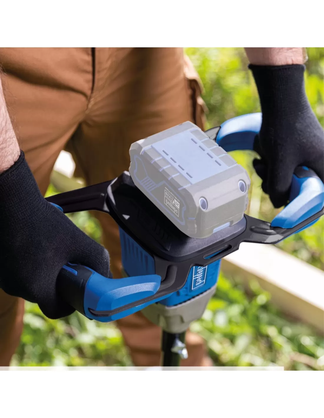 TRIVELLA A BATTERIA - Potente trivella di disseminazione, 125 giri/min, per la perforazione di pali di recinzione, fondazioni o fori di piante - Motore brushless esente da manutenzione, particolarmente efficiente, con maggiore autonomia e durata e bassa usura - Lavoro a batteria con la serie Scheppach IXES 20 Volt - tutte le batterie e i caricabatterie di questa serie di sistemi possono essere combinati con la trivella a batteria - Rapido, Sostituzione della coclea senza attrezzi - Diametro della coclea di 100 mm, lunghezza di 800 mm - 3 modalità di funzionamento - Eco, Power Mode, Funzionamento in senso antiorario - La doppia impugnatura con impugnatura morbida consente un lavoro ergonomico e molti usi.
