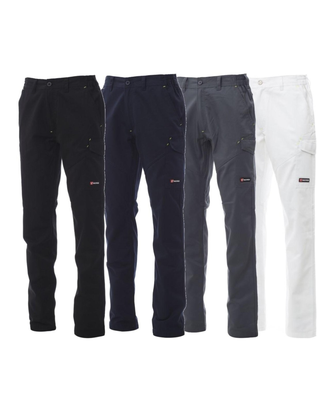 Pantalone unisex, multistagione, elastici laterali e passanti in vita, chiusura con zip e bottone in plastica, due tasche anteriori a taglio classico, una tasca laterale LOCK SYSTEM, un porta metro, due tasche posteriori una aperta e una con patta e velcro, impunture in tinta, bande reflex su tasca posteriore, cuciture triple.