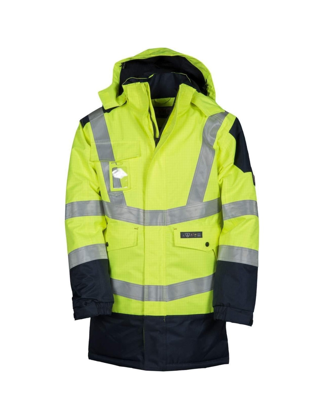 Parka trivalente ( antistatico, antiacido, ignifugo) bicolore in alta visibilità, con cappuccio a scomparsa; bande 3M Scotchlite, polsino regolabile elasticizzato, con ampie tasche frontali, una tasca al petto e portabadge a scomparsa.