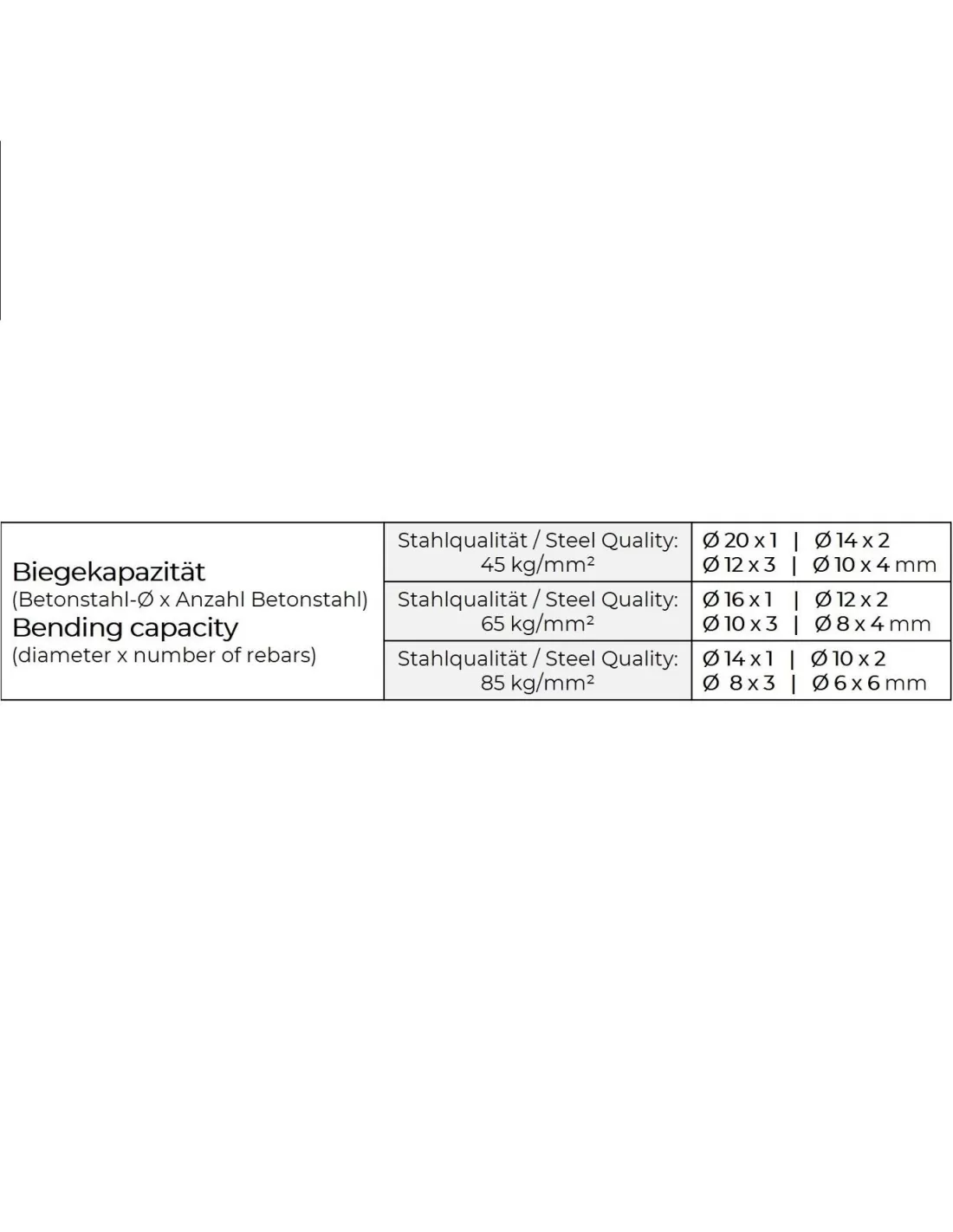 • Capacità di piegatura in in base alla qualità dell'acciaio (diametro x numero di barre di acciaio)
