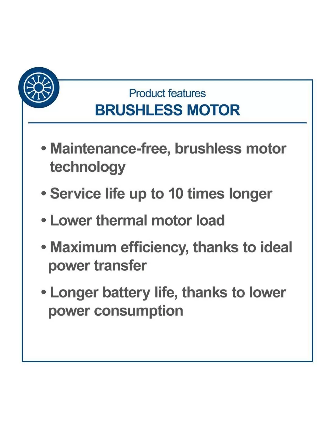 - Motore senza spazzole esente da manutenzione con efficienza particolarmente elevata, durata di funzionamento più lunga, lunga durata e bassa usura