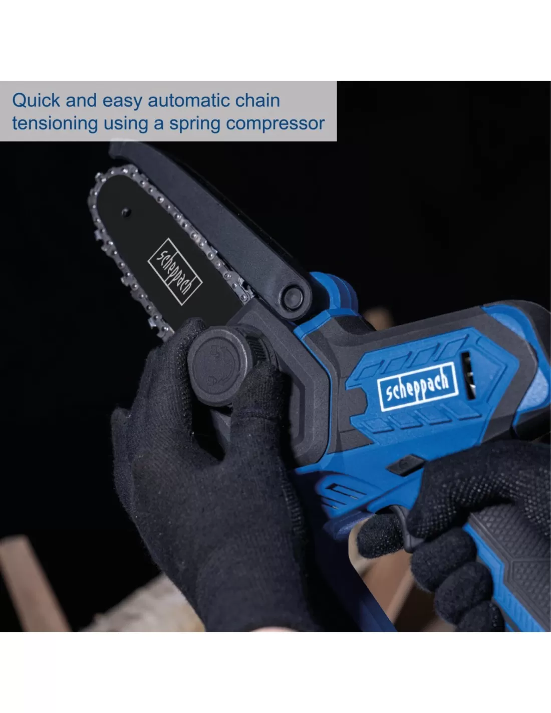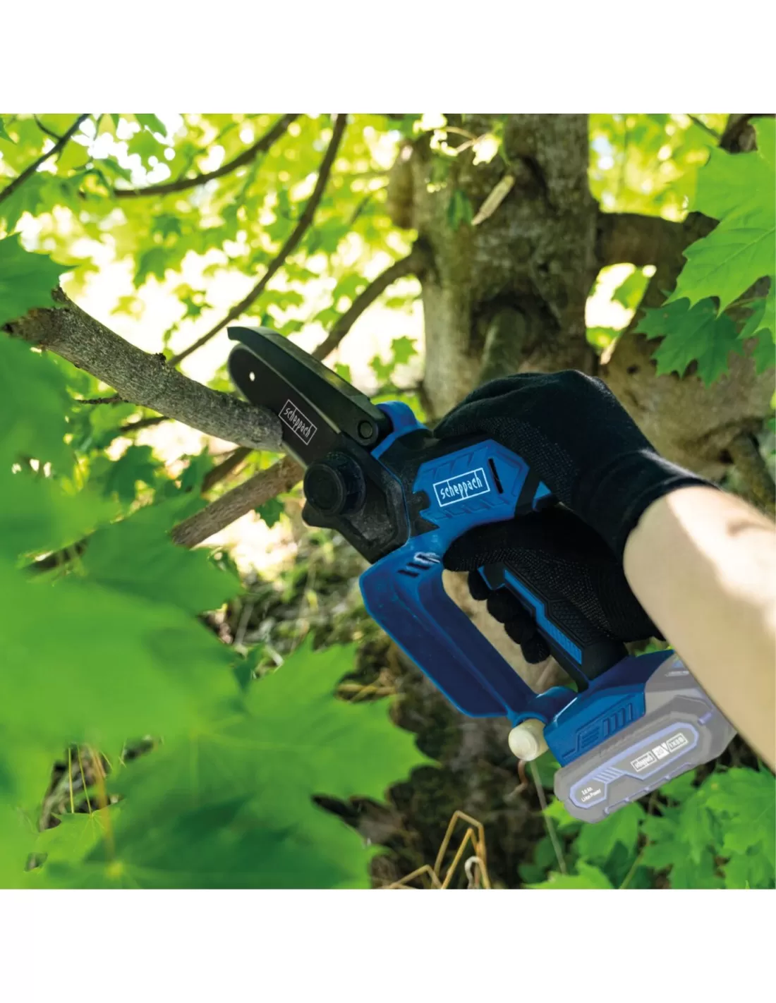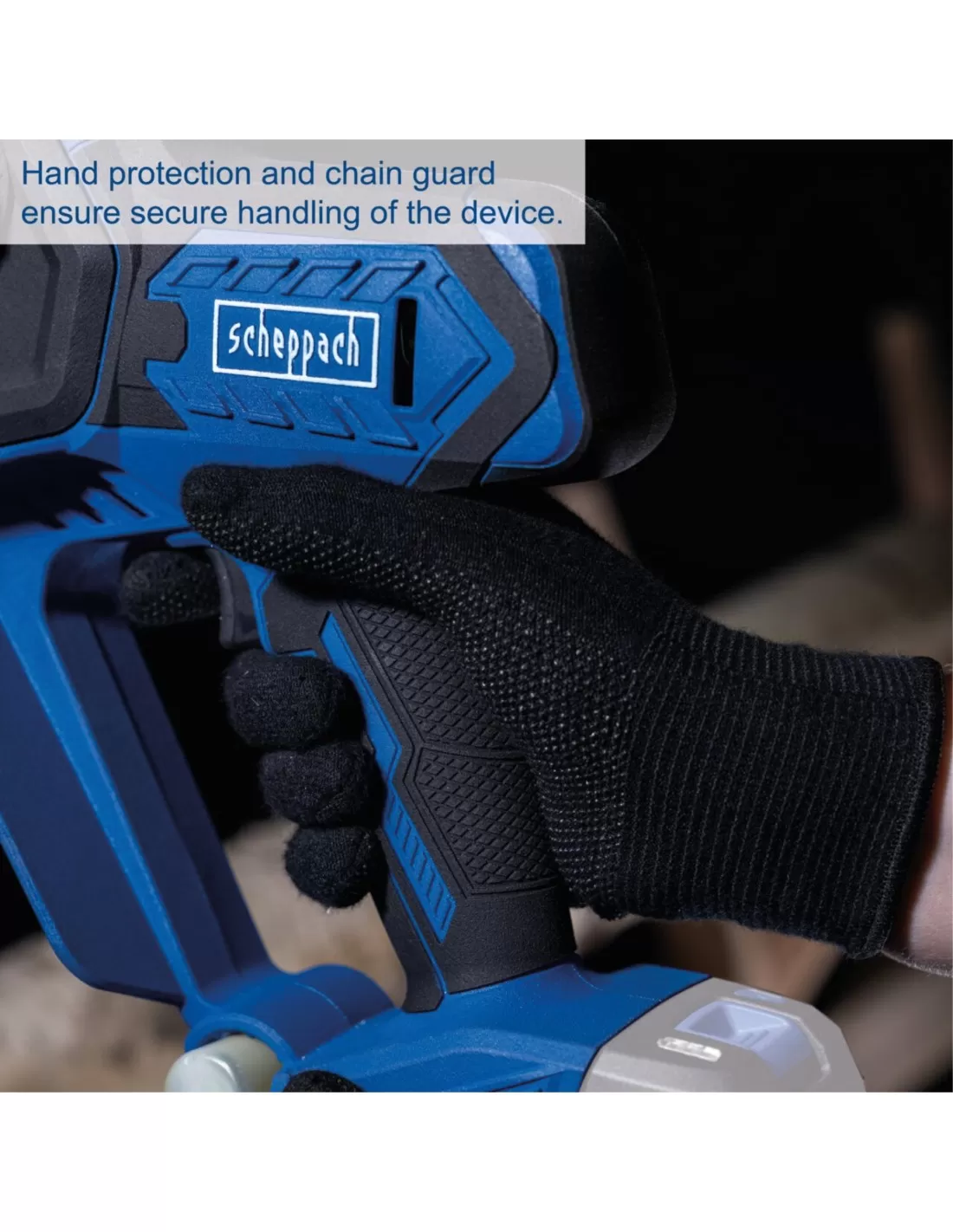 SEGA DA POTATURA A BATTERIA • Seghetto da potatura compatto e leggero per il taglio di alberi e arbusti e per ridurre i rifiuti verdi in piccoli pezzi • Adatto anche per il taglio di assi, legname quadrato e rotondo e per progetti fai-da-te • Lavoro a batteria con la serie Scheppach IXES 20 Volt – tutte le batterie e i caricabatterie appartenenti a questa serie di sistemi possono essere combinati con la sega da potatura a batteria • Grande lama e catena ProCut da 5" • Velocità di taglio fino a 4,8 m/ s garantisce un avanzamento rapido - Il design compatto consente di lavorare in aree di difficile accesso - Catena liscia, basse vibrazioni - Spessore di taglio massimo di 127 mm - Impugnatura soft-grip con interruttore di sicurezza - Protezione per le mani e protezione della catena per una manipolazione sicura del dispositivo - Regolazione della tensione della catena - Pratica conservazione del flacone dell'olio sul dispositivo - Batteria e caricabatterie disponibili separatamente
