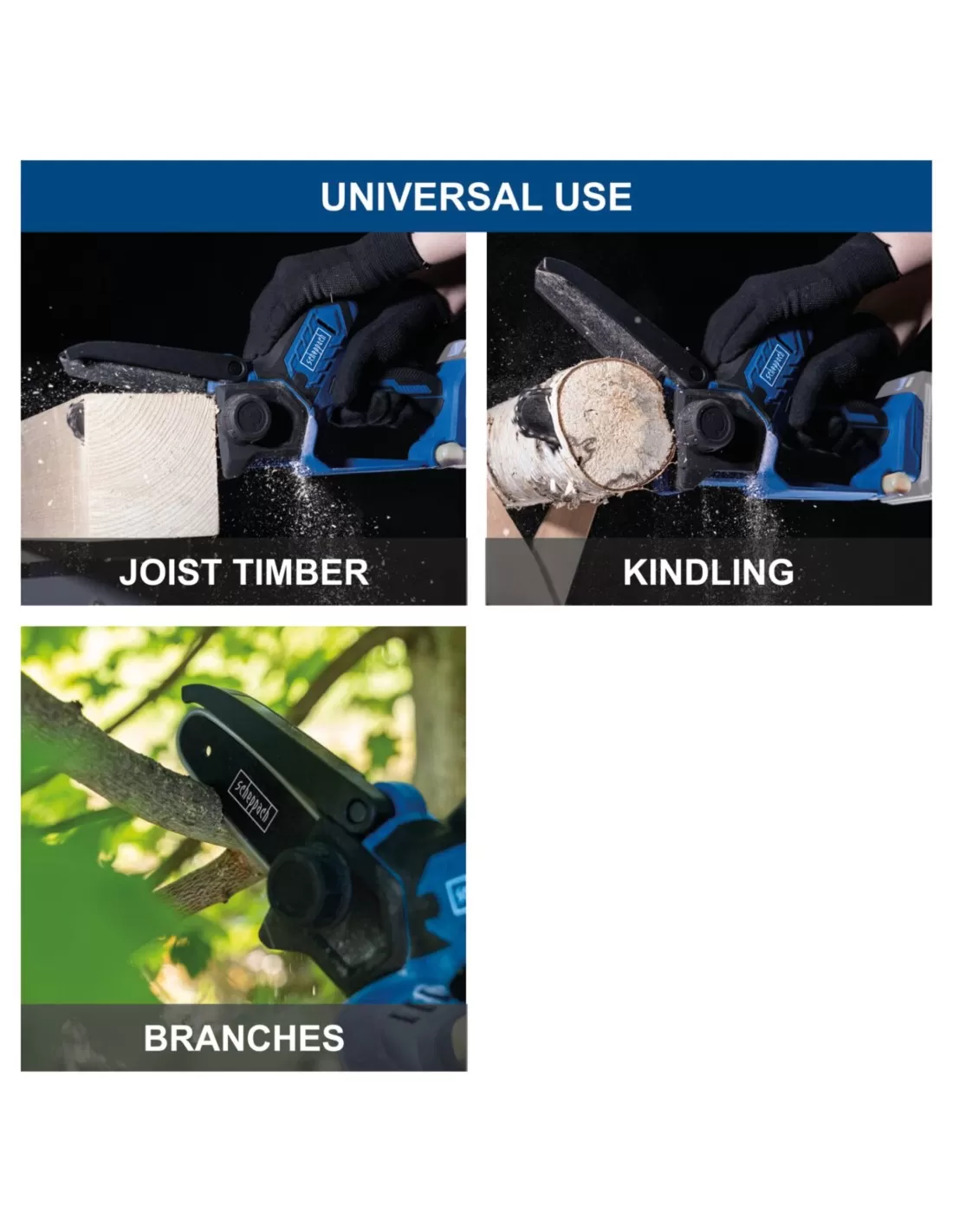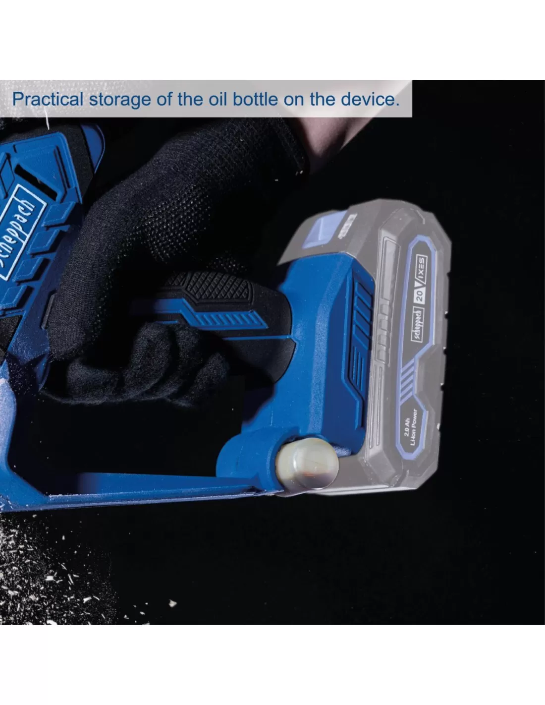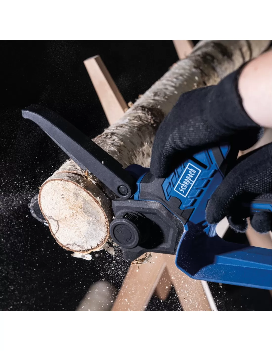 SEGA DA POTATURA A BATTERIA • Seghetto da potatura compatto e leggero per il taglio di alberi e arbusti e per ridurre i rifiuti verdi in piccoli pezzi • Adatto anche per il taglio di assi, legname quadrato e rotondo e per progetti fai-da-te • Lavoro a batteria con la serie Scheppach IXES 20 Volt – tutte le batterie e i caricabatterie appartenenti a questa serie di sistemi possono essere combinati con la sega da potatura a batteria • Grande lama e catena ProCut da 5" • Velocità di taglio fino a 4,8 m/ s garantisce un avanzamento rapido - Il design compatto consente di lavorare in aree di difficile accesso - Catena liscia, basse vibrazioni - Spessore di taglio massimo di 127 mm - Impugnatura soft-grip con interruttore di sicurezza - Protezione per le mani e protezione della catena per una manipolazione sicura del dispositivo - Regolazione della tensione della catena - Pratica conservazione del flacone dell'olio sul dispositivo - Batteria e caricabatterie disponibili separatamente
