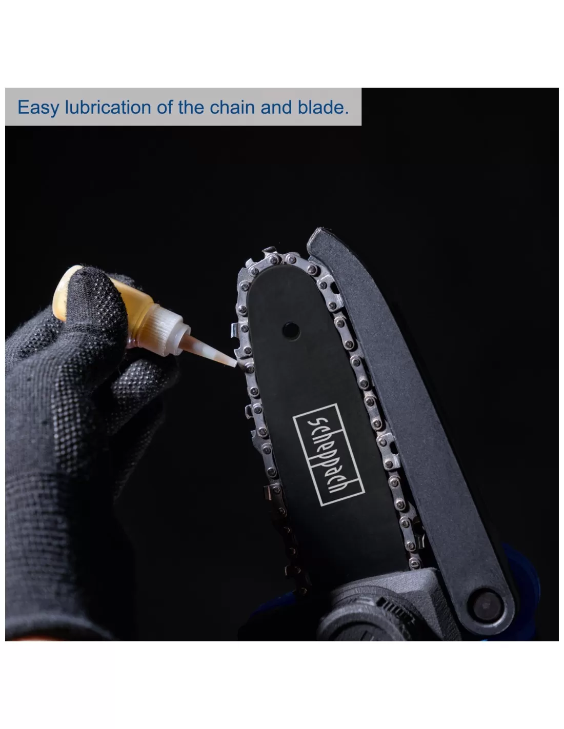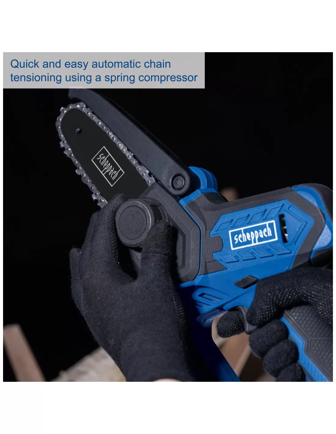SEGA DA POTATURA A BATTERIA • Seghetto da potatura compatto e leggero per il taglio di alberi e arbusti e per ridurre i rifiuti verdi in piccoli pezzi • Adatto anche per il taglio di assi, legname quadrato e rotondo e per progetti fai-da-te • Lavoro a batteria con la serie Scheppach IXES 20 Volt – tutte le batterie e i caricabatterie appartenenti a questa serie di sistemi possono essere combinati con la sega da potatura a batteria • Grande lama e catena ProCut da 5" • Velocità di taglio fino a 4,8 m/ s garantisce un avanzamento rapido - Il design compatto consente di lavorare in aree di difficile accesso - Catena liscia, basse vibrazioni - Spessore di taglio massimo di 127 mm - Impugnatura soft-grip con interruttore di sicurezza - Protezione per le mani e protezione della catena per una manipolazione sicura del dispositivo - Regolazione della tensione della catena - Pratica conservazione del flacone dell'olio sul dispositivo