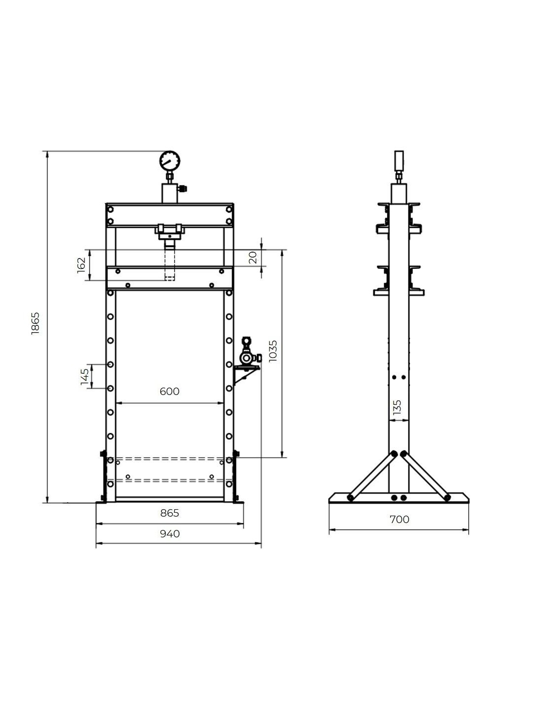 Il robusto cilindro idraulico monostadio, può effettuare pressioni fino a 30t, visualizzabile tramite il manometro incluso nella macchina.