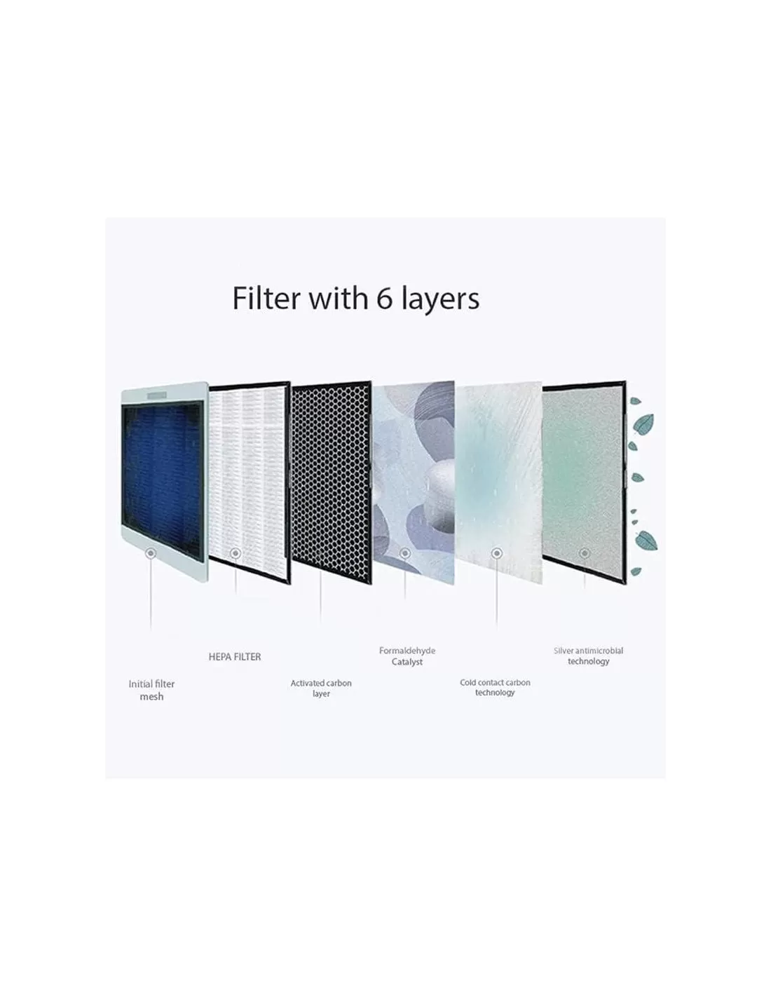 Questo purificatore d'aria con filtro HEPA incorpora 6 livelli di filtraggio adatti a neutralizzare particelle di polvere, batteri, polline, acari, peli, vapori, fumi, e anche l’inquinamento esterno. Rimuove le impurità dall'aria, attaccando allo stesso tempo la presenza di virus e batteri.
