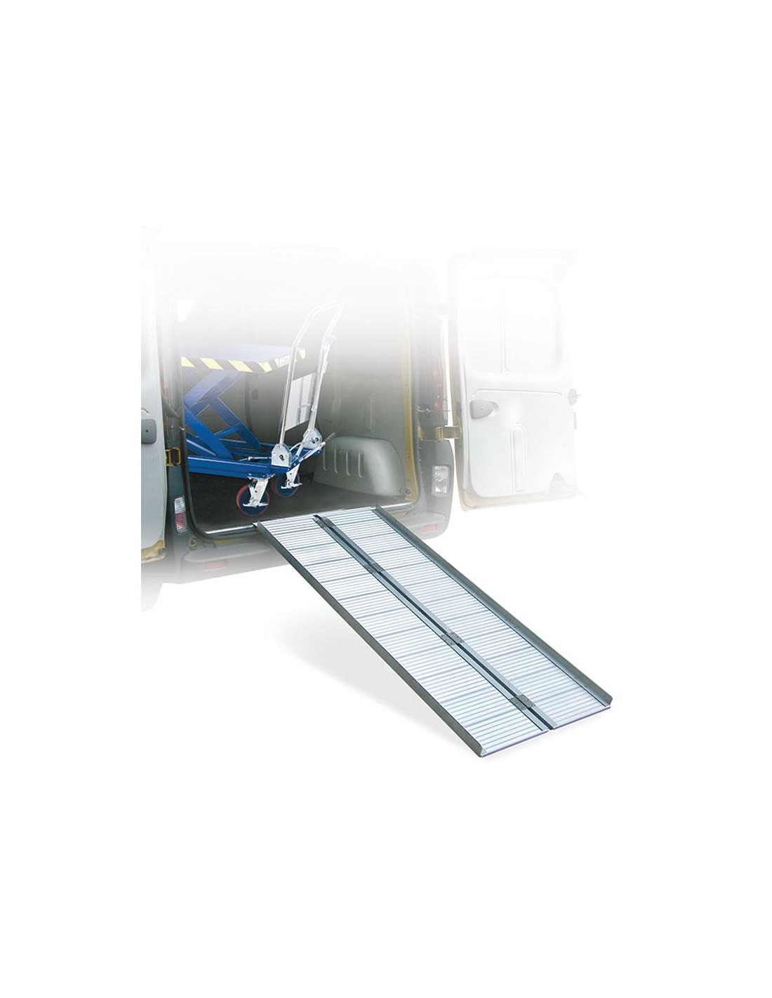 In alluminio con pavimenti antisdrucciolo. Portata 170kg Le rampe di carico sono dispositivi di collegamento utilizzati da persone e/o mezzi di trasporto spinti a mano, come vie di passaggio fra veicoli di trasporto merci ed il suolo (banchina di carico). In particolare, queste rampe sono denominate ponti di carico mobili, ad azionamento manuale. Ciascuna rampa è composta dalle seguenti parti: longheroni laterali, piastre fissate ai longheroni tramite rivettatura, cerniere centrali per il ripiegamento della rampe ai fini del trasporto, dalla maniglia di presa per il sollevamento ed il trasporto, due perni di sicurezza presenti in corrispondenza del “labbro†di appoggio. Possono essere utilizzate anche all’esterno, ma in assenza di condizioni meteorologiche avverse, come pioggia intensa, neve e ghiaccio. Non utilizzare le rampe di carico se sono coperte di ghiaccio o di fango